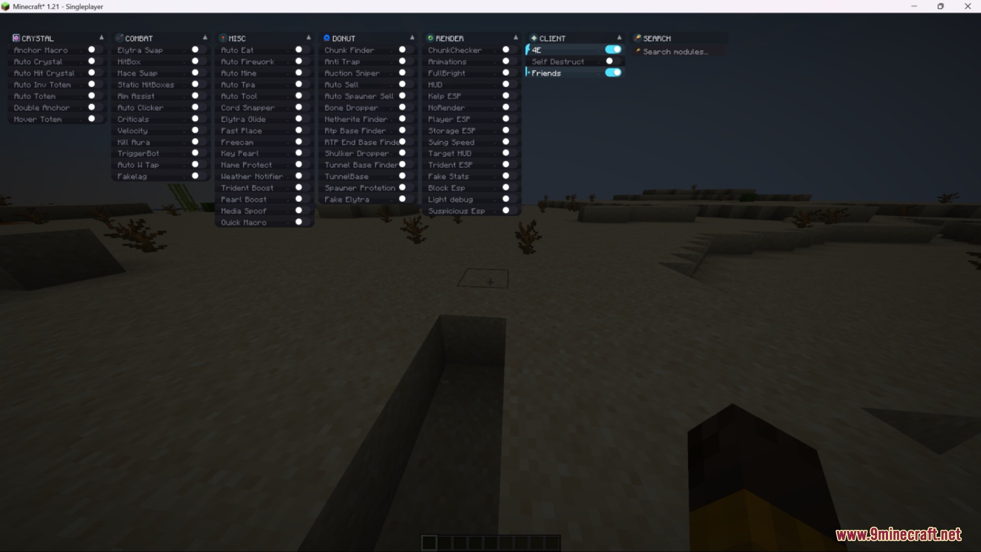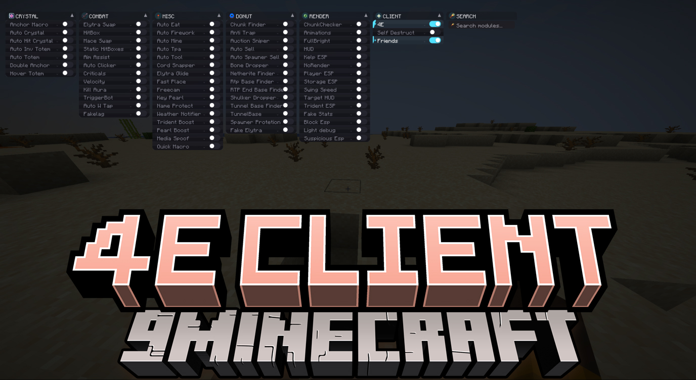 4E Client Mod (1.21.1) is a multifunction Minecraft ghost / utility client designed mainly for DonutSMP and Anarchy Servers. It provides a large collection of combat, exploration, automation, and render modules, allowing players to gain full control over combat, base hunting, movement, and visual assistance.