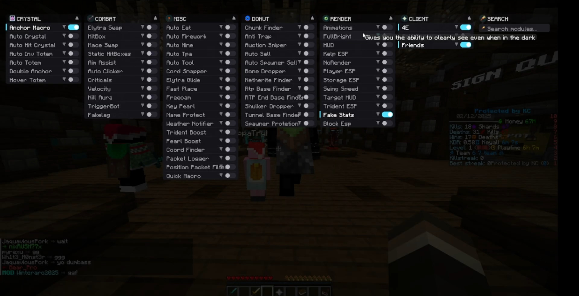 Chunk Finder– Find loaded and special chunksBase Finder– Locate hidden player basesTunnel Base Finder– Detect underground basesRTP End Base Finder– Search bases in End dimension- Restored Donut modules removed from official clients