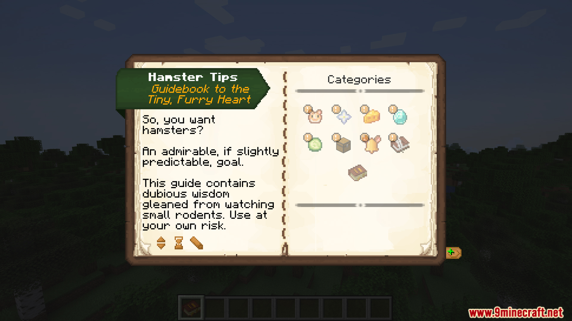 - Shoulder launching/dismount puts hamster on shoulder, dismounts precisely at the block looking in (range 4.5 blocks), configurable to avoid accidental ejection (e.g. when dismounting horse or building nether bridge)