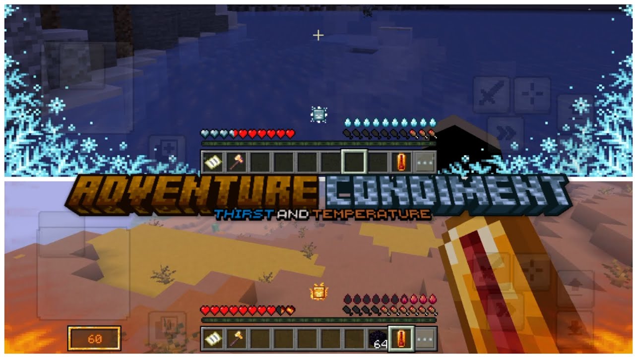 Adventure Condiment Addon (1.21) adds realistic thirst and body temperature mechanics to make survival more challenging and immersive. Manage hydration alongside hunger, adapt to biomes/weather/fire with craftable gear, or suffer screen effects, damage, and death.