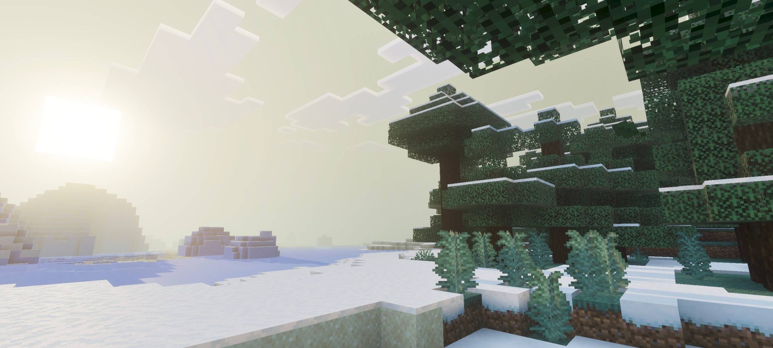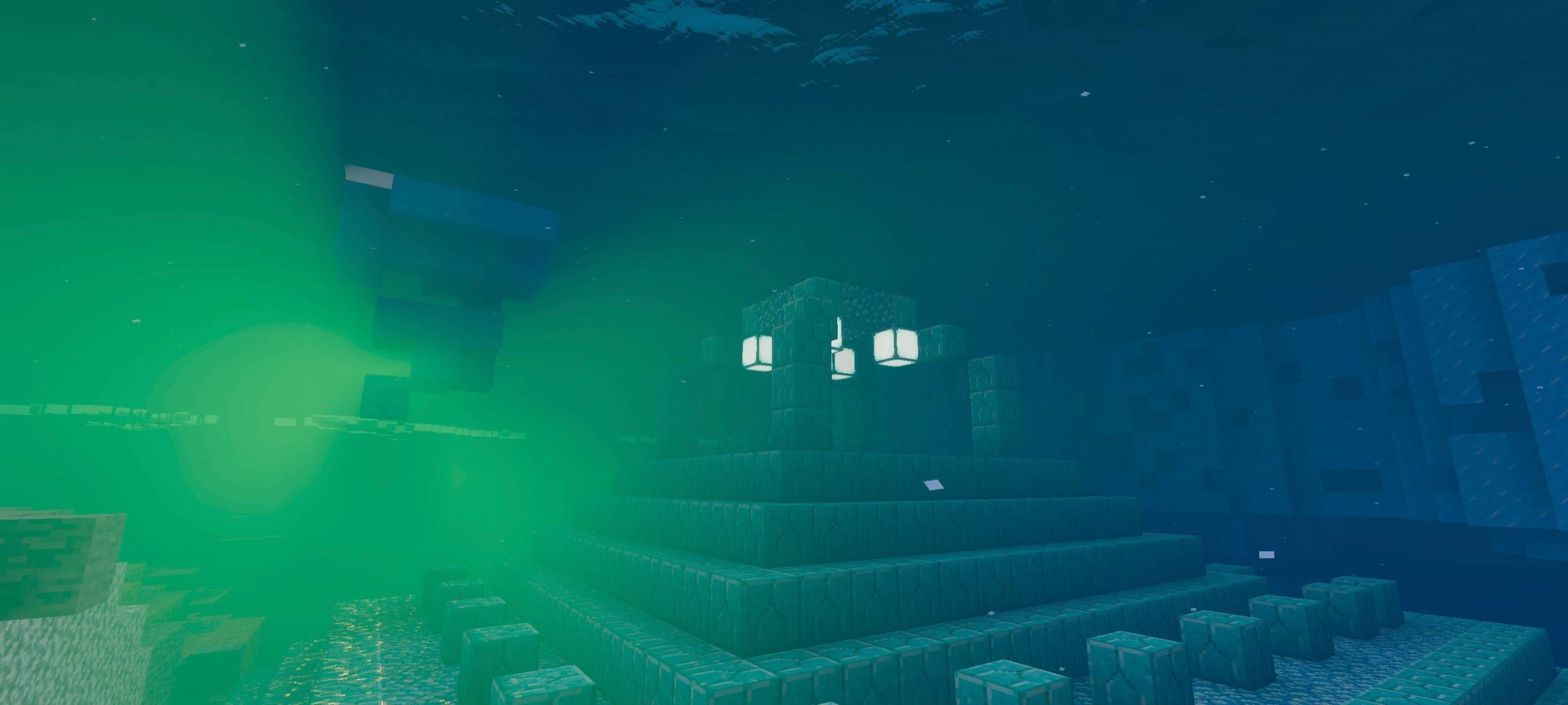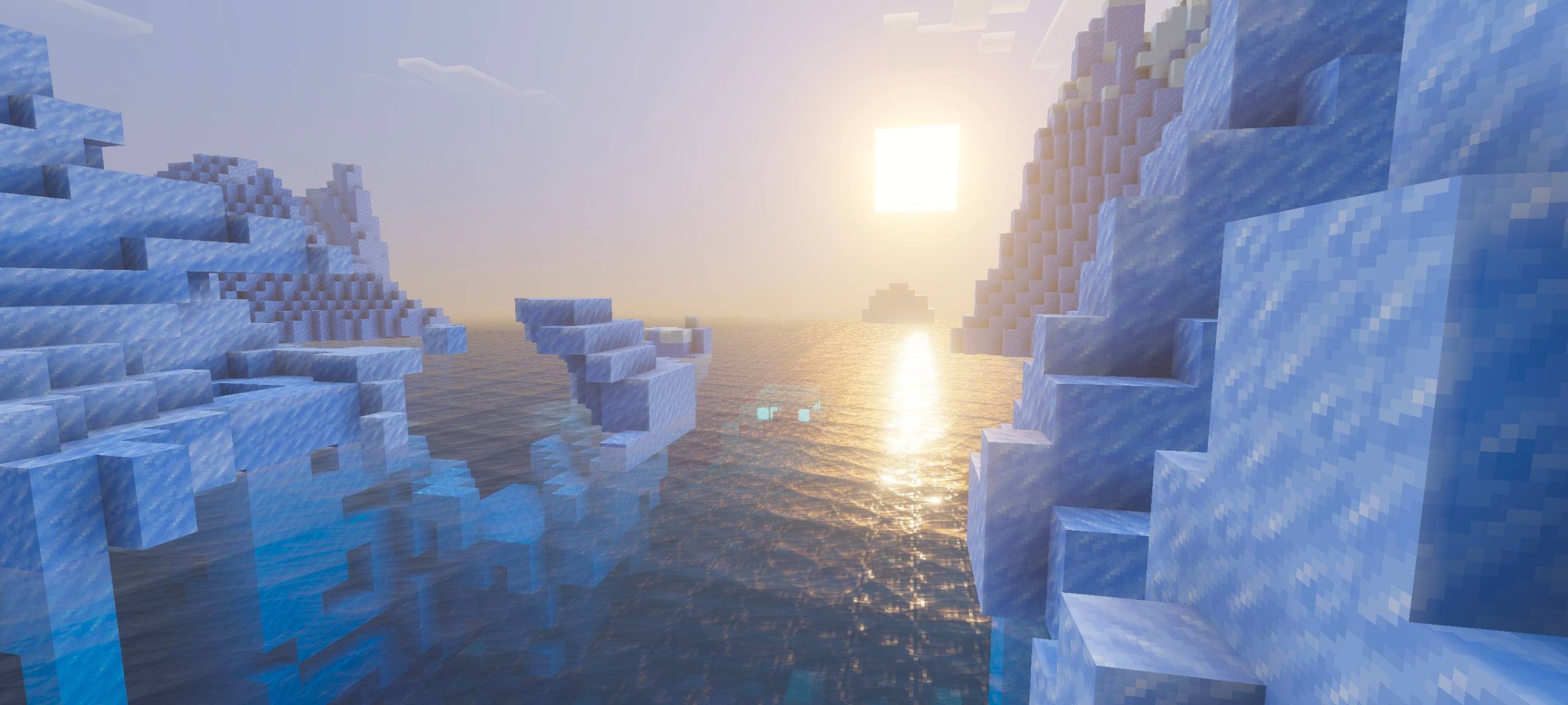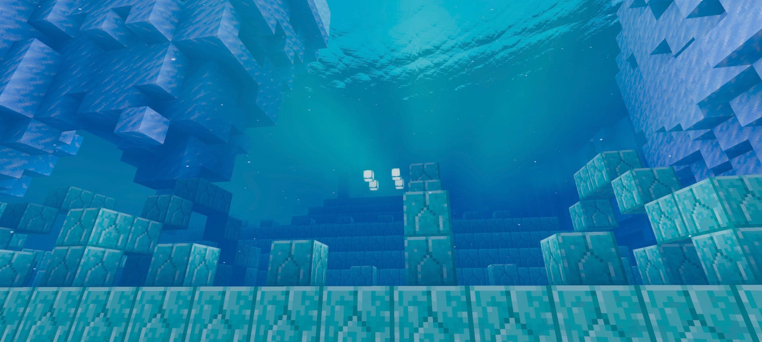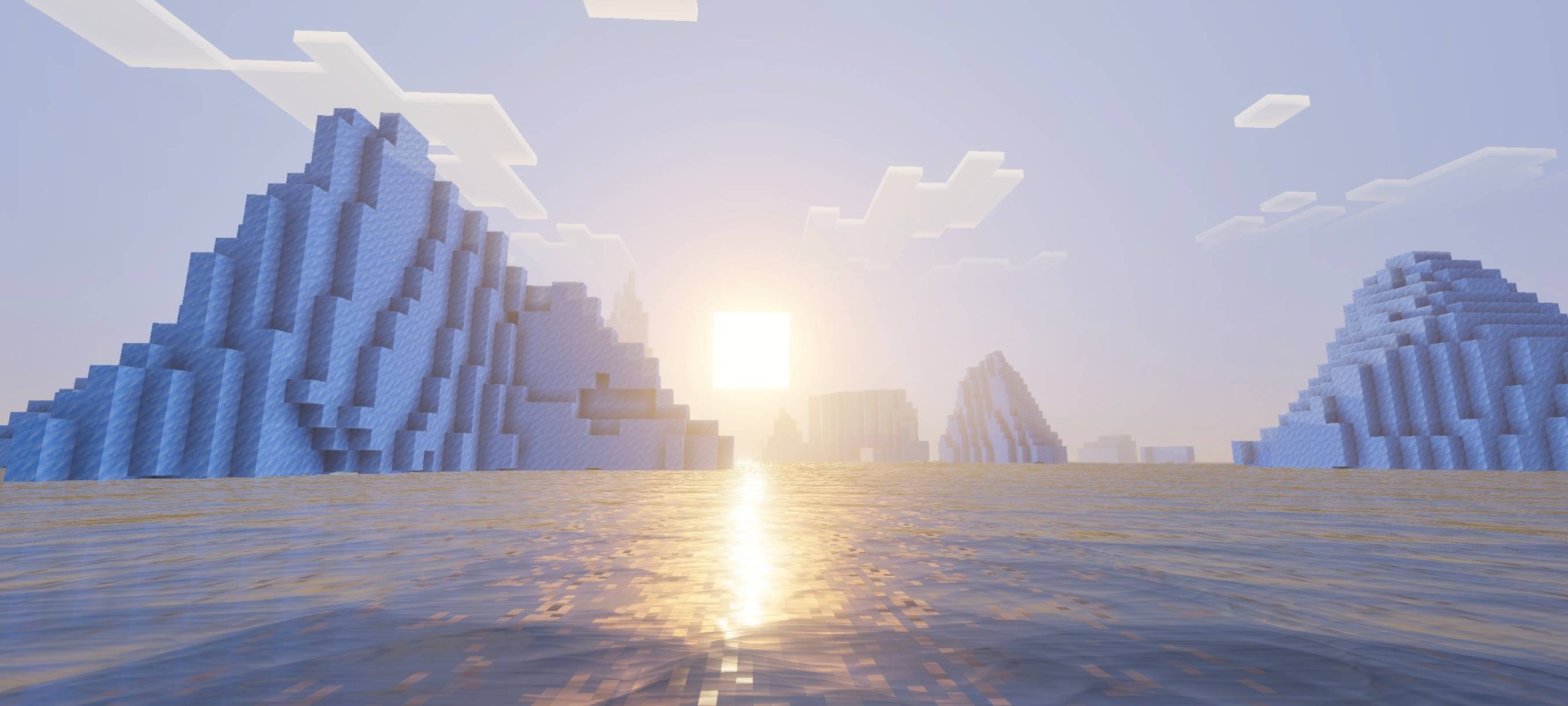 Aether Visual Dimension Shader creates light and bright images in a sky-like style. The lighting has a diffused effect, and the water has reflections. Caves and underwater areas appear to have depth. The space feels peaceful and unique.