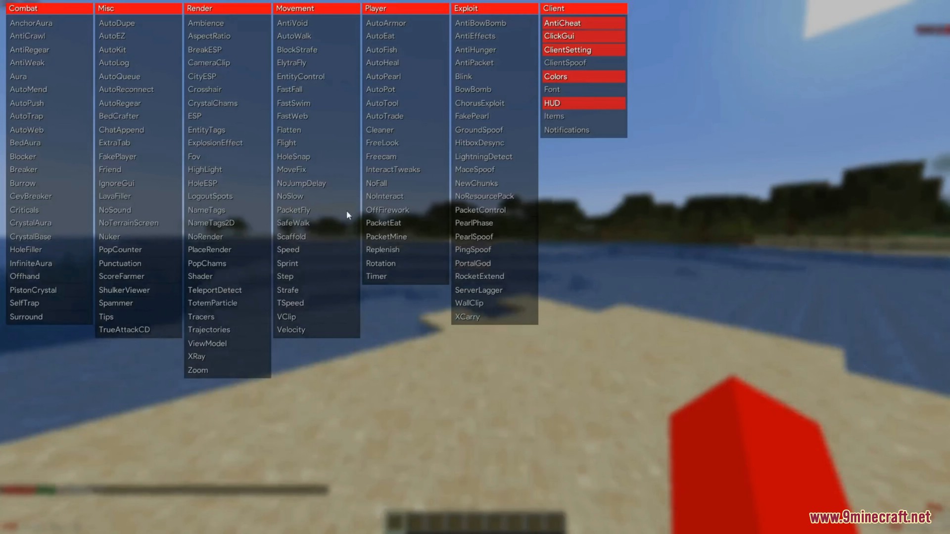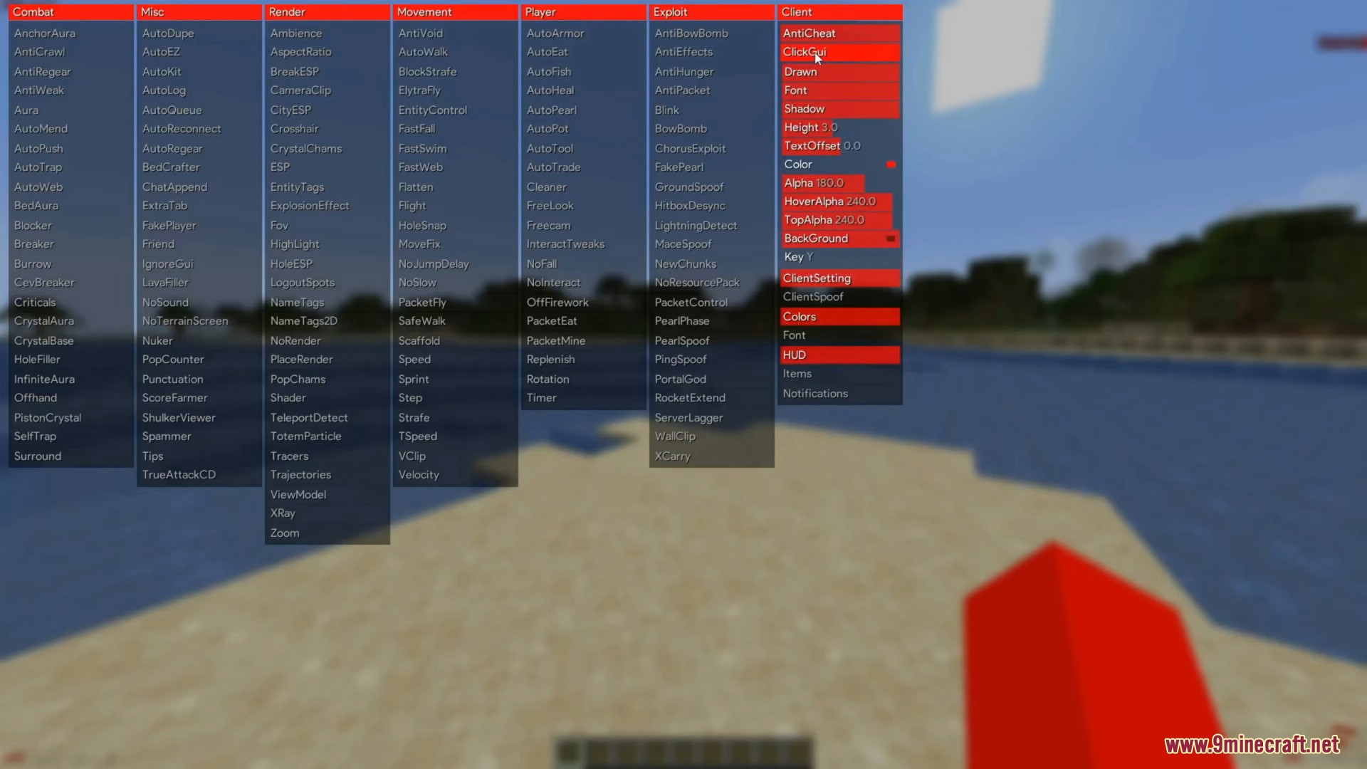 - Client spoofing and interface controls including AntiCheat toggles and ClickGUI settings.