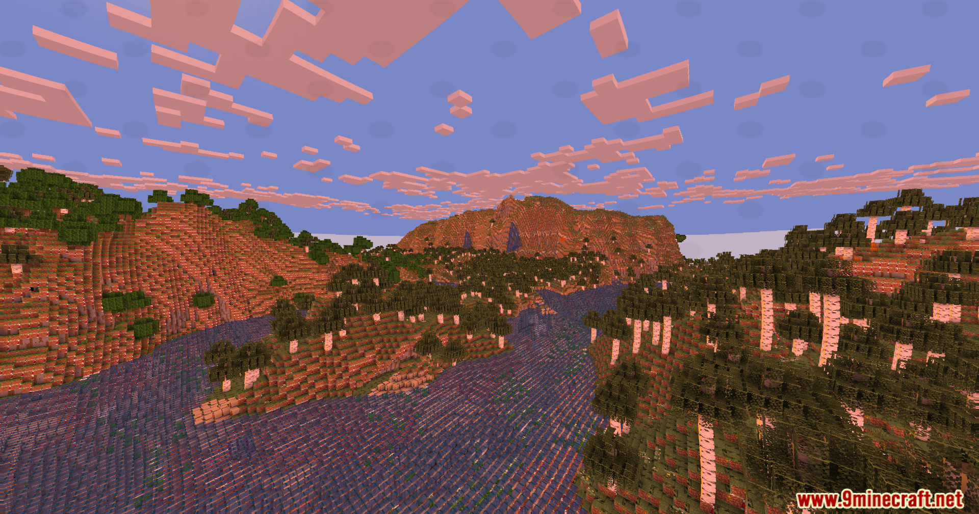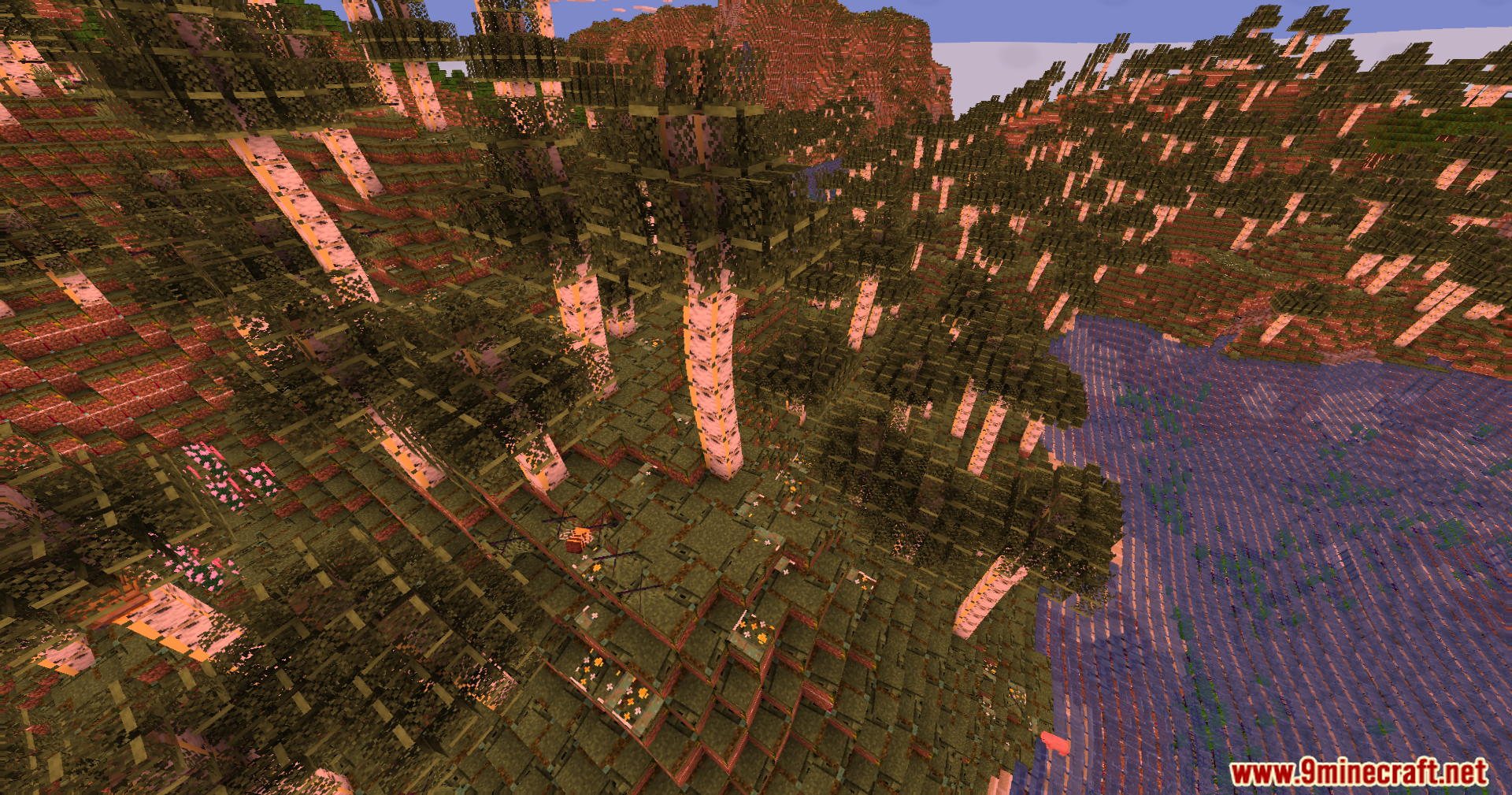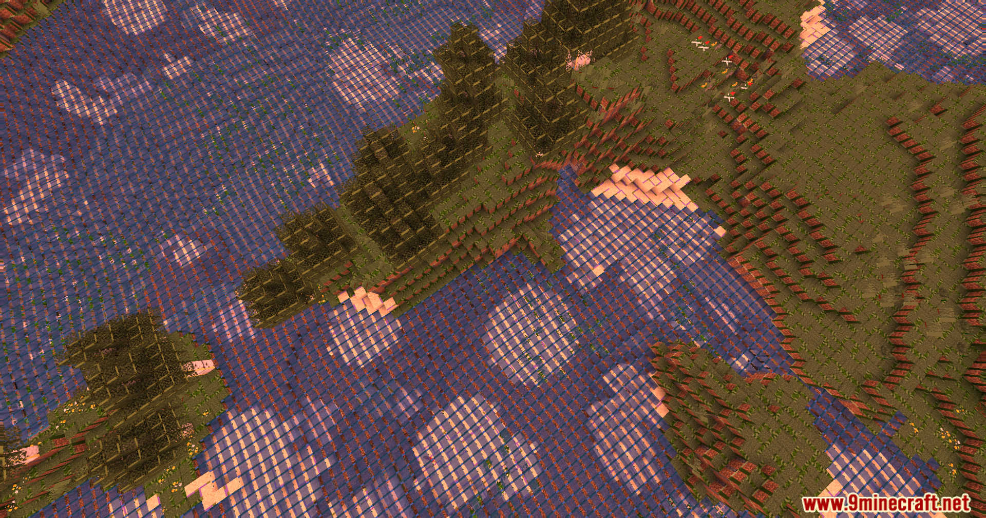 AlternateCraft Shaders (1.21.11, 1.20.1) modifies how textures and surfaces are rendered by introducing pulsing motion, wave-like deformation, and subtle pattern flow across the world. Color tones are shifted to create an altered, dreamlike atmosphere, while selected areas emit faint glow effects that reinforce the unreal visual style.