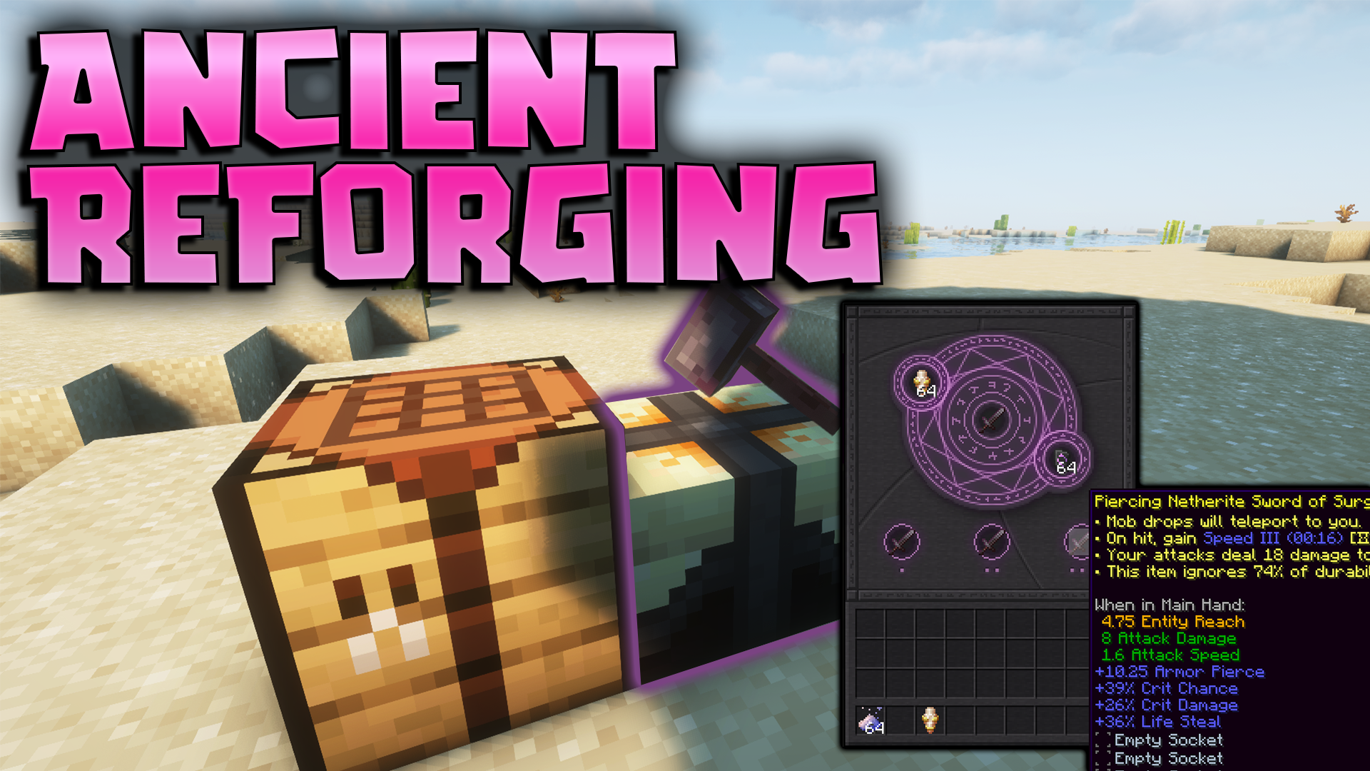 - Adds a dedicated reforging table to Apotheosis, enabling players to reforge tools and gear into the Ancient rarity using ancient materials, resulting in superior equipment.