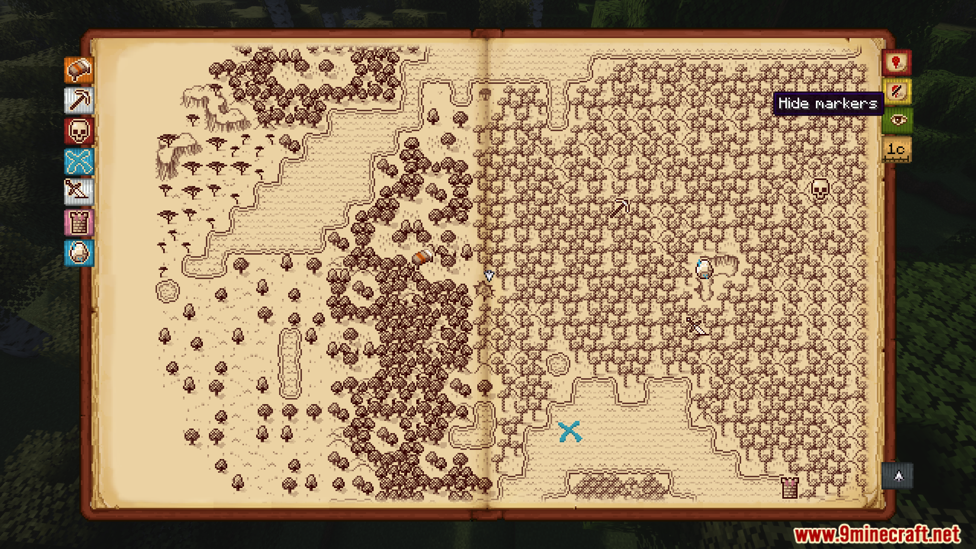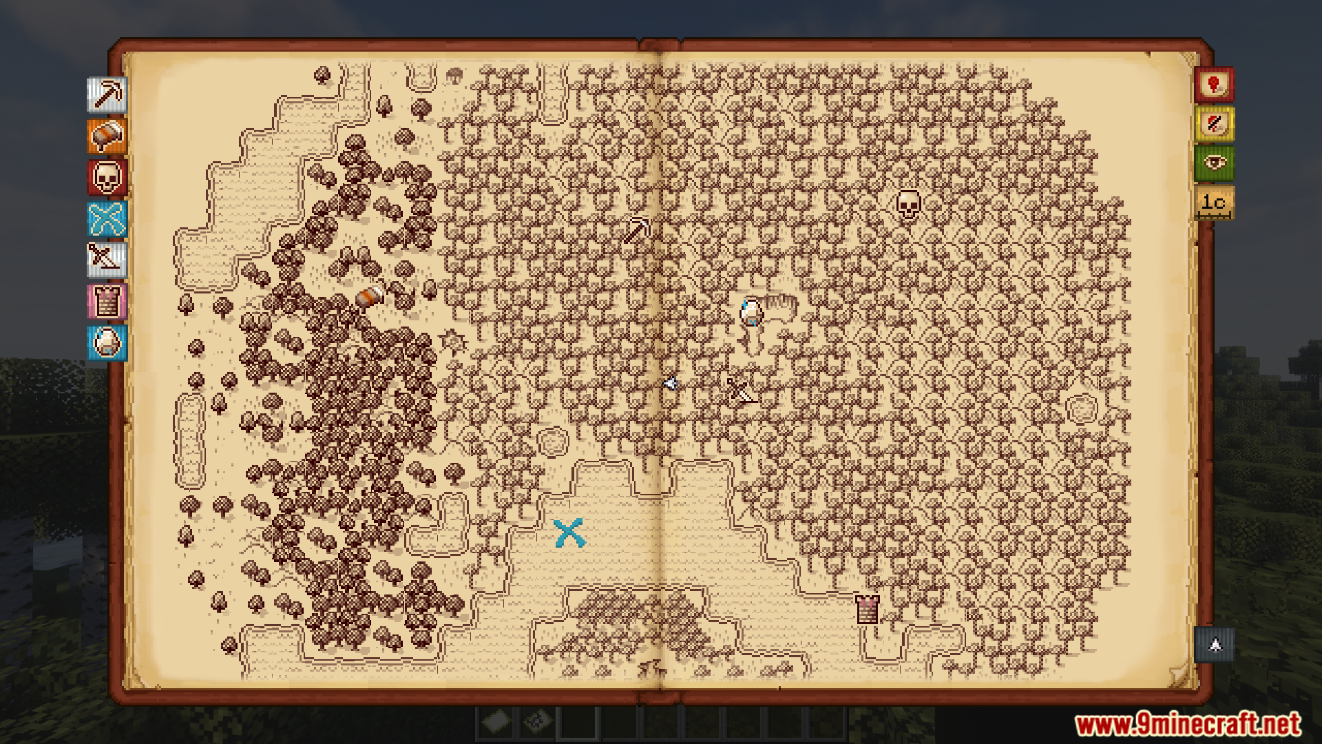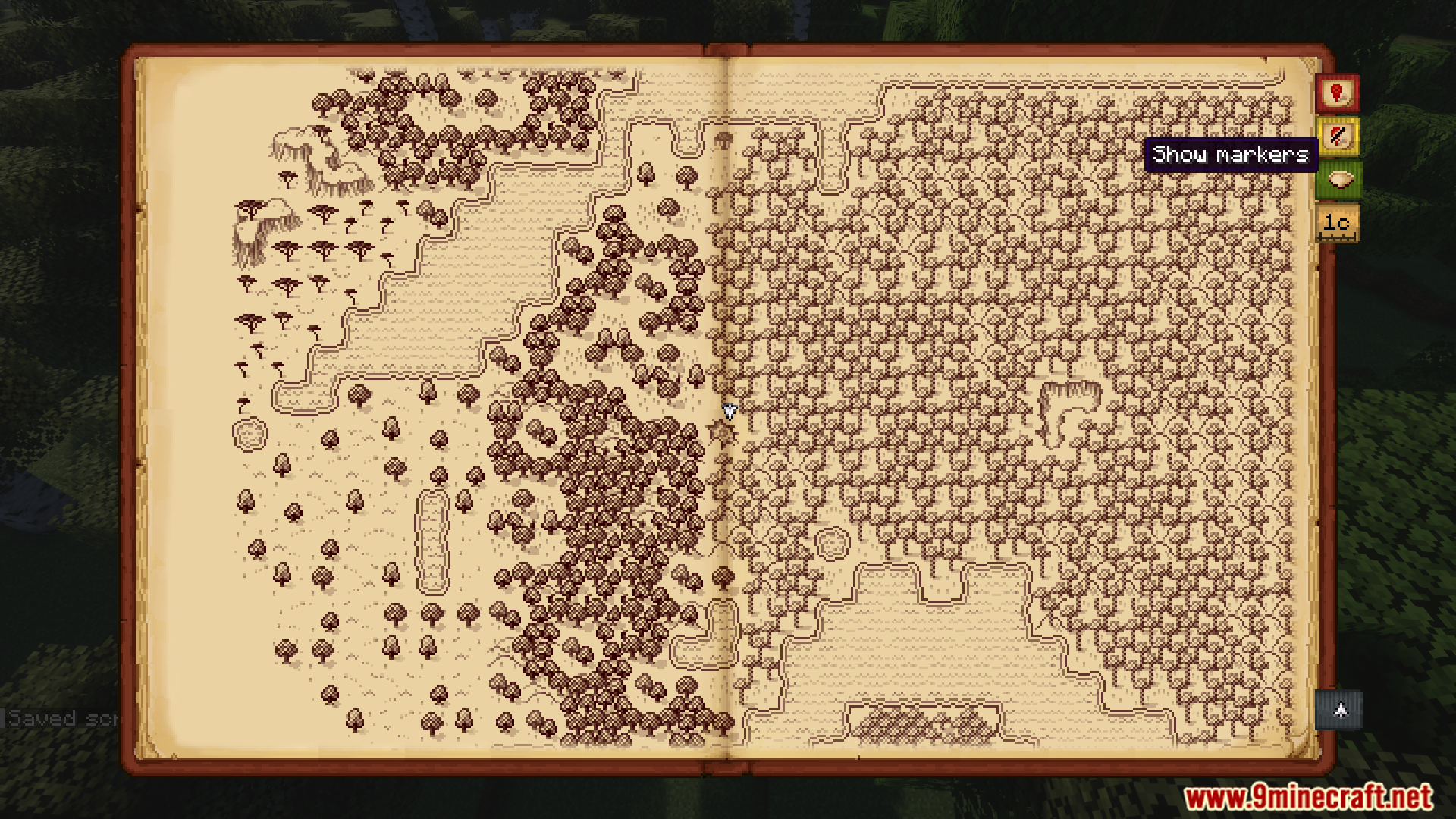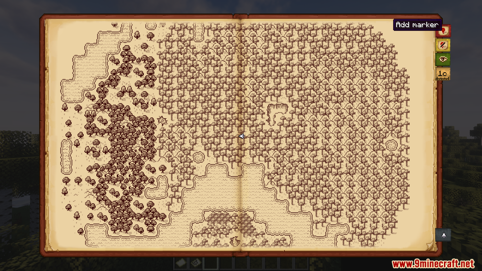 - Replaces the default map with a detailed, scrollable parchment atlas that fills in as you explore, featuring biome-specific textures and elevation shading.