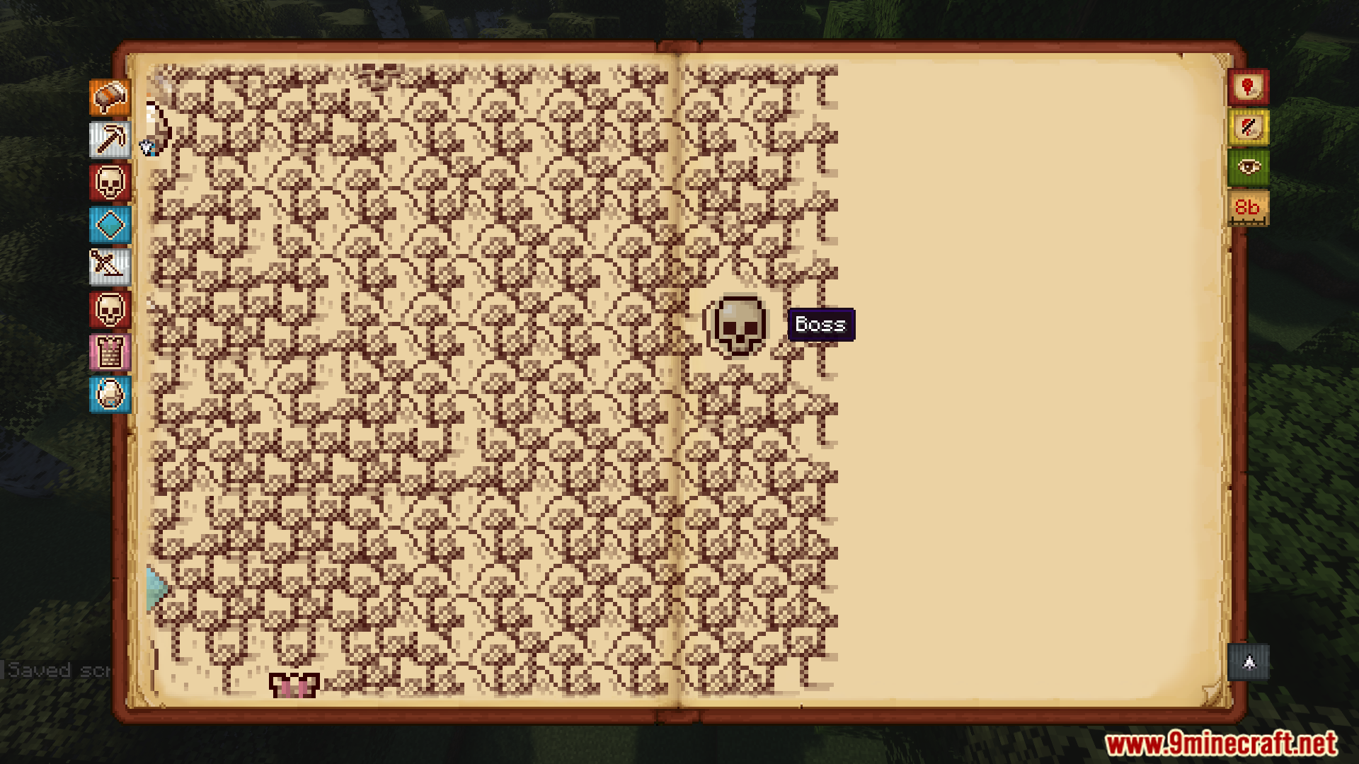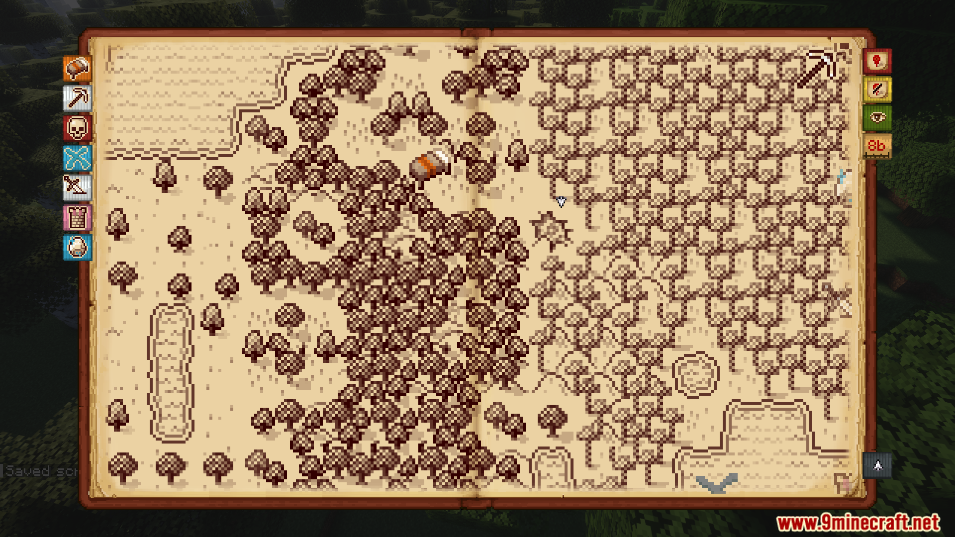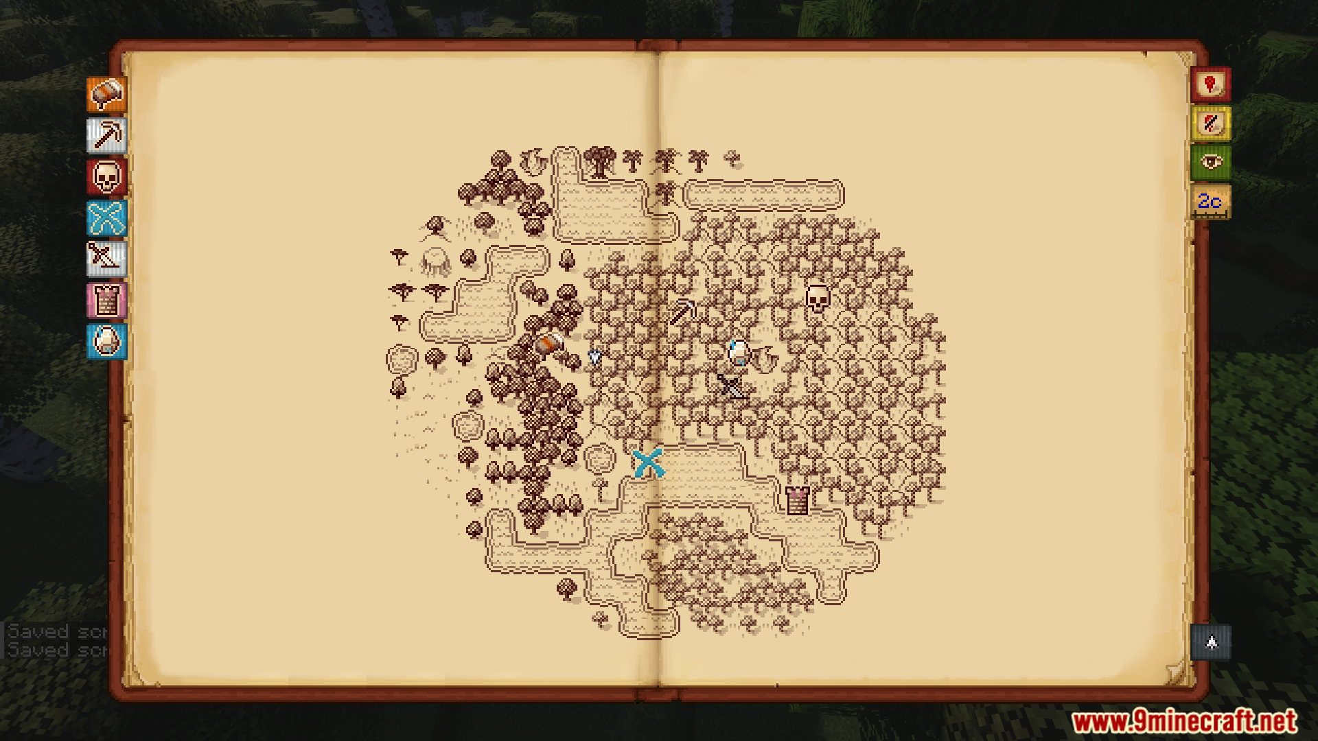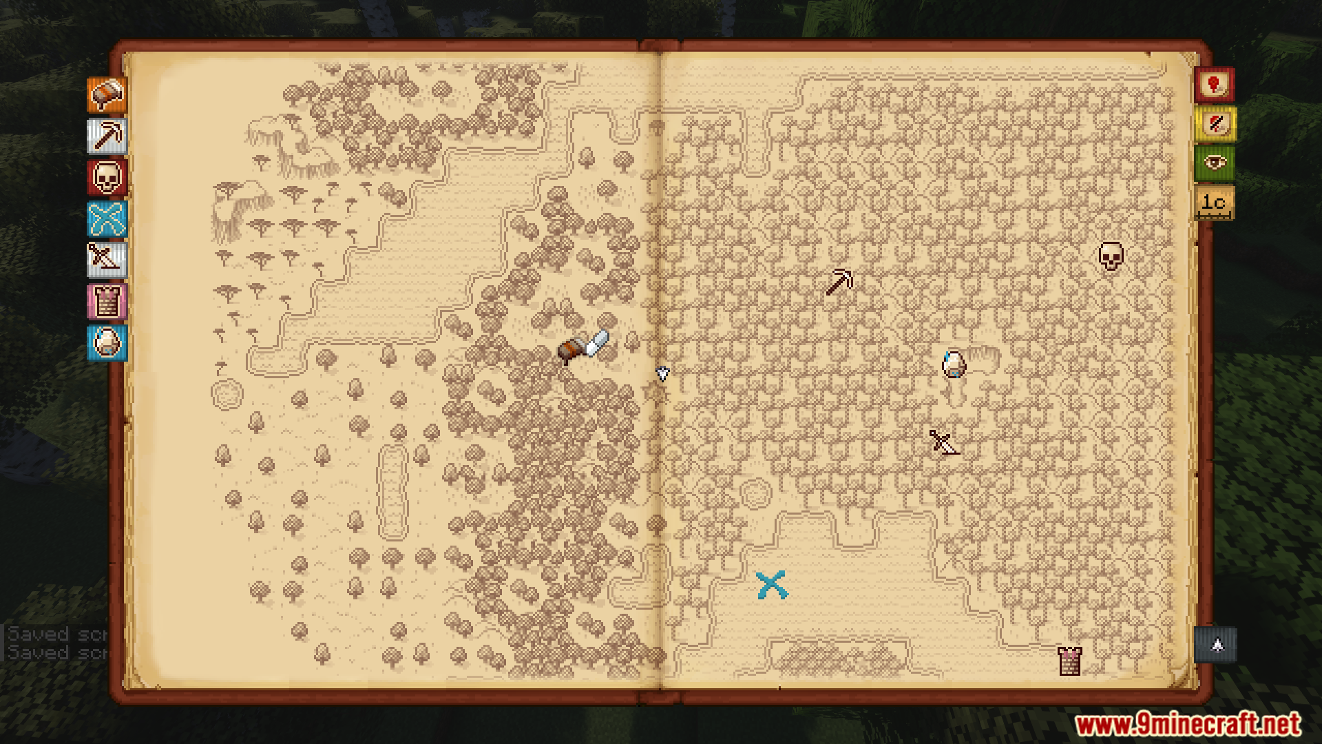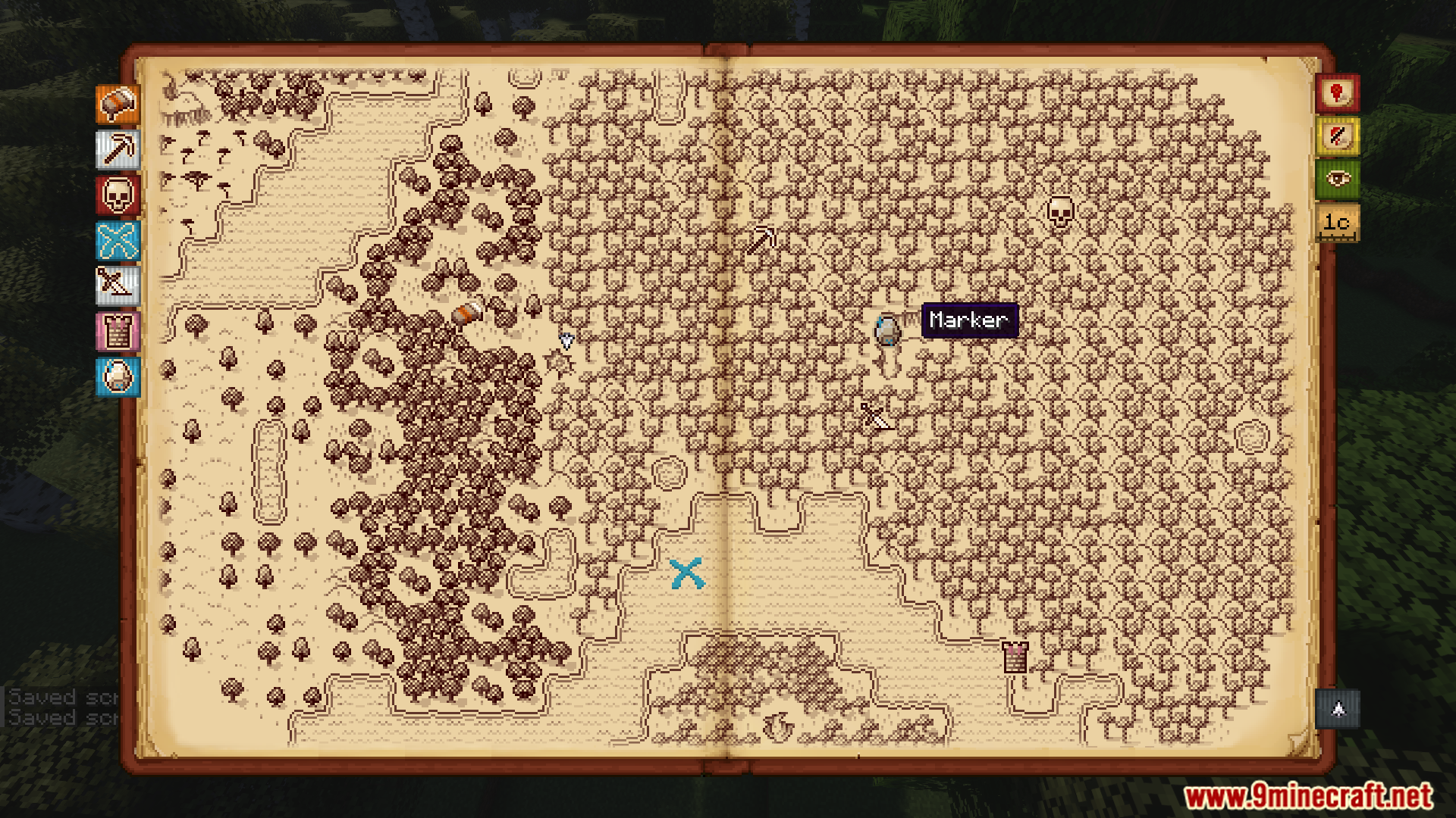 - Replaces the default map with a detailed, scrollable parchment atlas that fills in as you explore, featuring biome-specific textures and elevation shading.