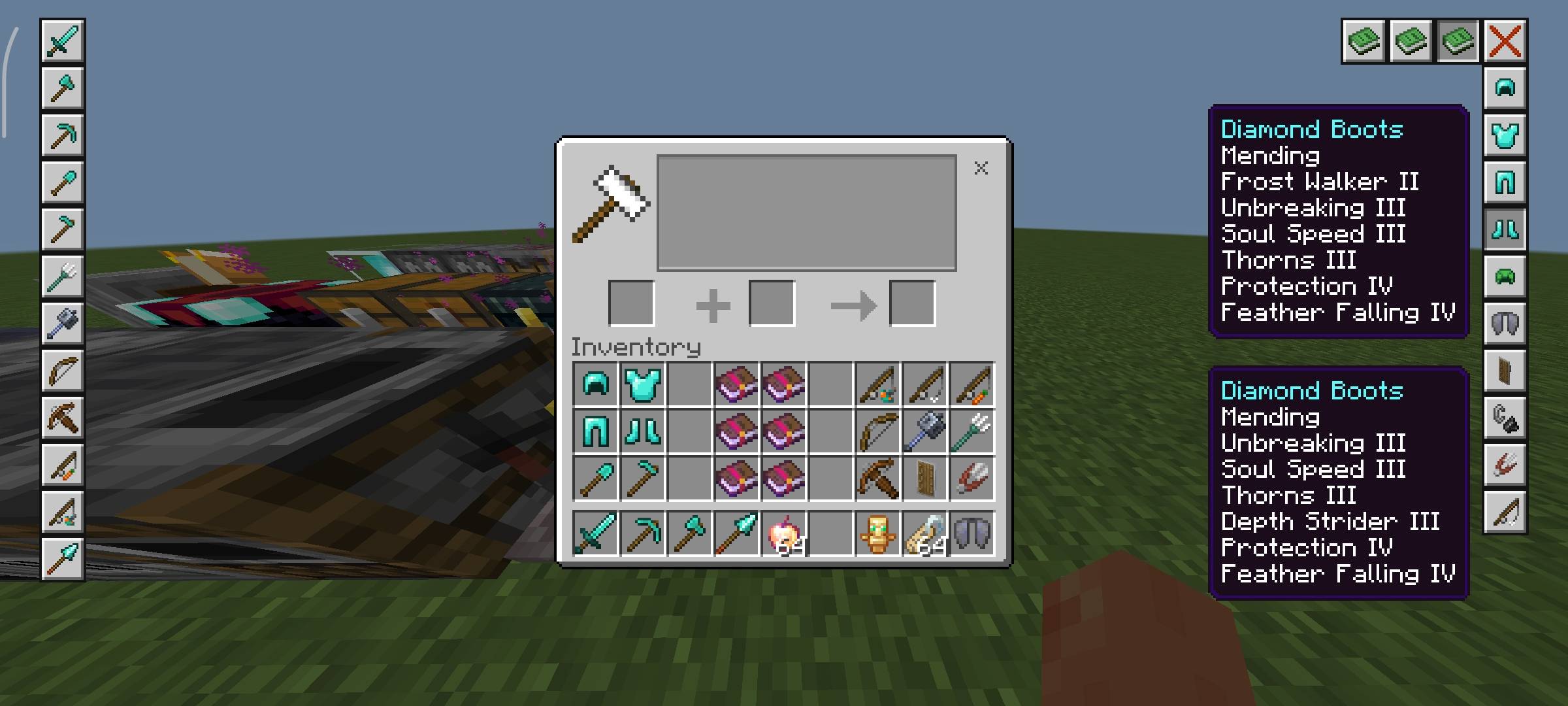 Anvil Guide Texture Pack (1.26, 1.21) adds information panels directly to the forging interface. This system provides the best spell recipes, color codes for renaming, and special names that create effects for creatures. Four buttons are integrated in the right corner of the screen for quick access to necessary items.