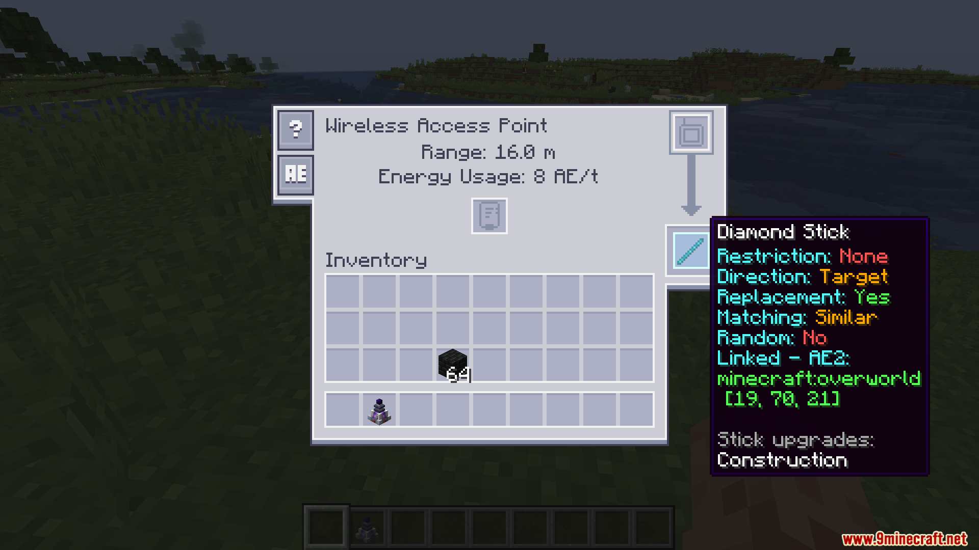 Applied Construction Sticks Mod (1.21.1, 1.21) lets Construction Sticks pull blocks directly from your Applied Energistics 2 (AE2) network instead of your inventory. Once linked through a ME Wireless Access Point, the stick automatically uses stored items, making large‑scale building faster and more convenient.