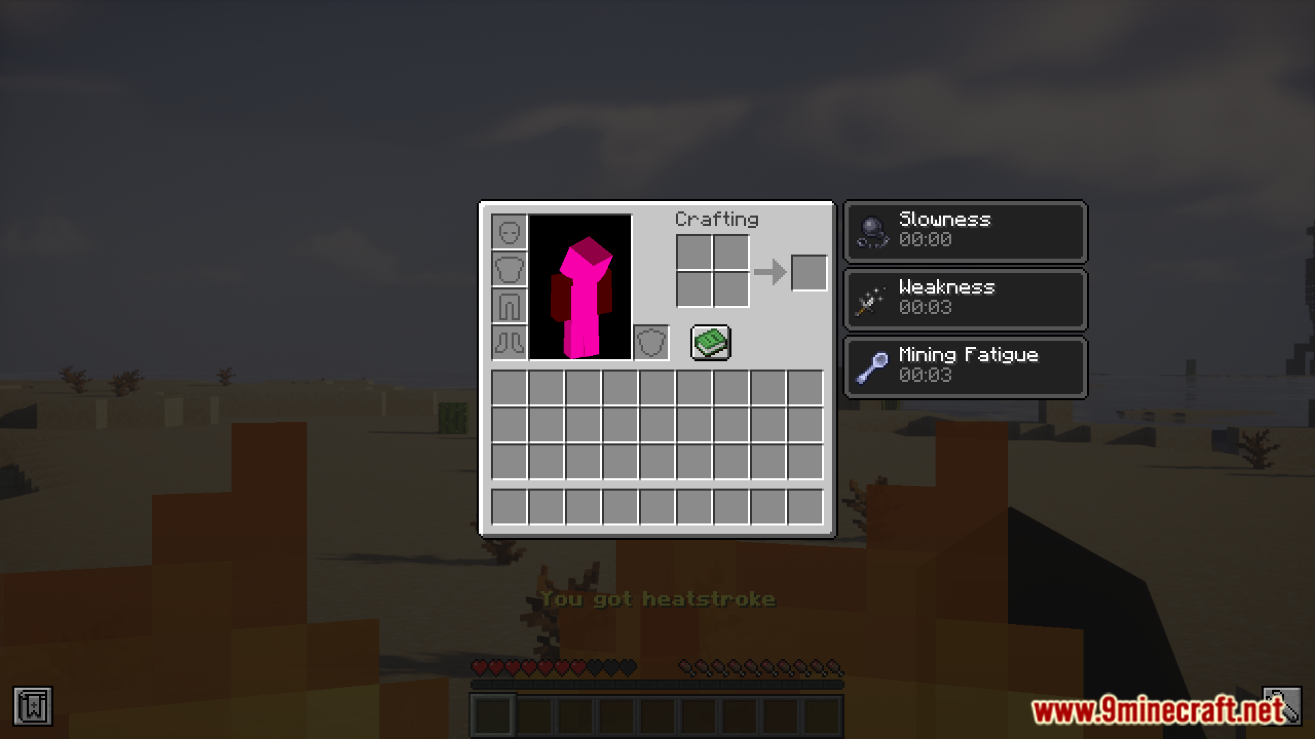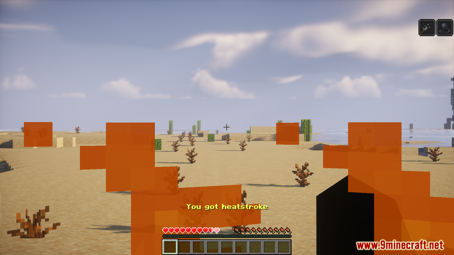 - Heatstroke: Give player Weakness and Slowness or Mining Fatigue when player is on fire more than 5s in hot biome.