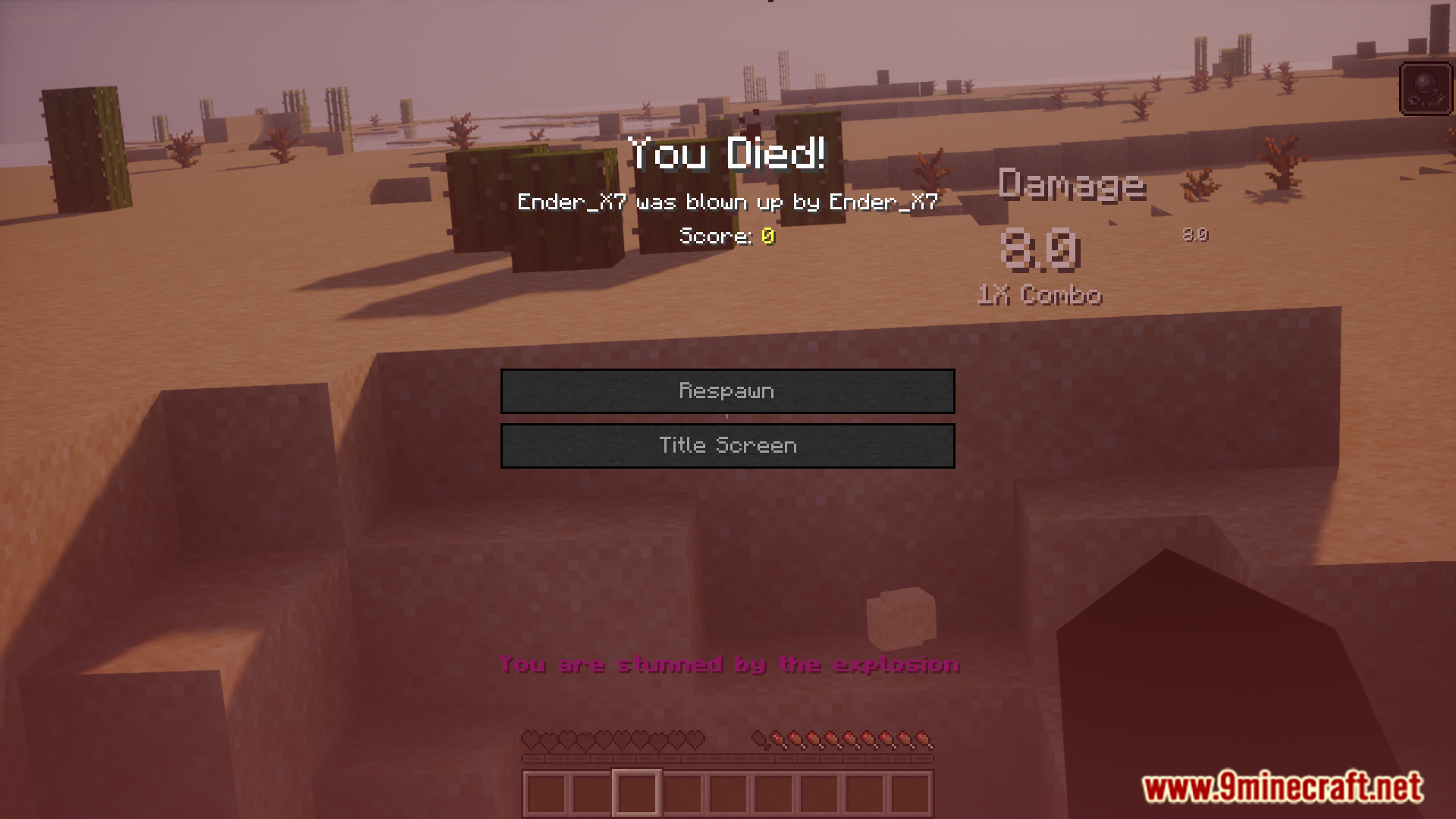 - Stun: Taking explosion damage will give you Slowness (duration increases based on the damage you take). If you take equal or more than 5 hearts damage, you will gain additional Nausea.