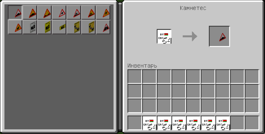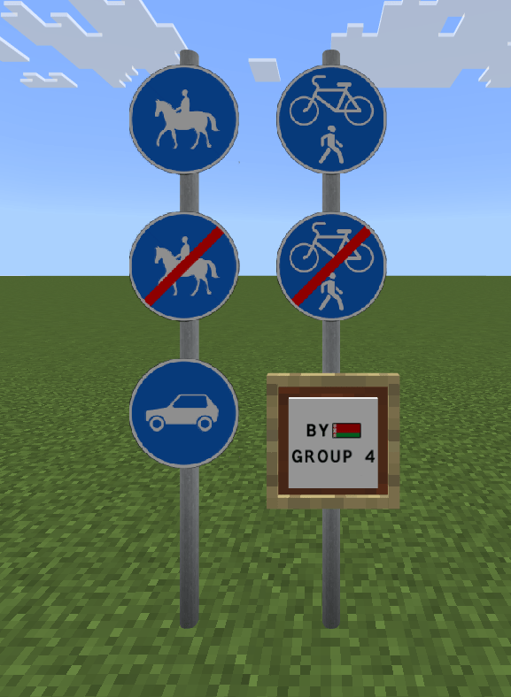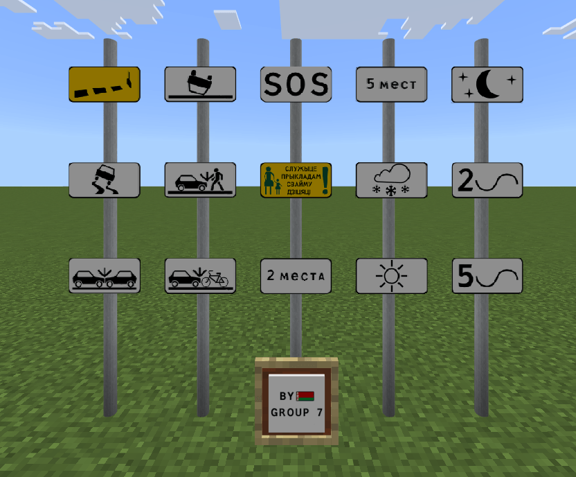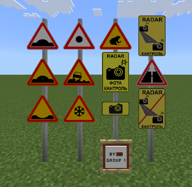 Belarusian Road Signs Addon (1.21, 1.20) adds more Belarusian road signs and is used with RRS+. Getting the signs is quite simple, just put the “group” item in the stone cutting table and you can choose the desired sign type.