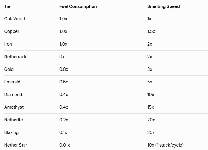 Better Smelters Addon (1.21) adds 11 tiers of upgraded furnaces crafted from vanilla materials and rare items, each smelting faster with better fuel efficiency (lower consumption = more smelts per fuel).