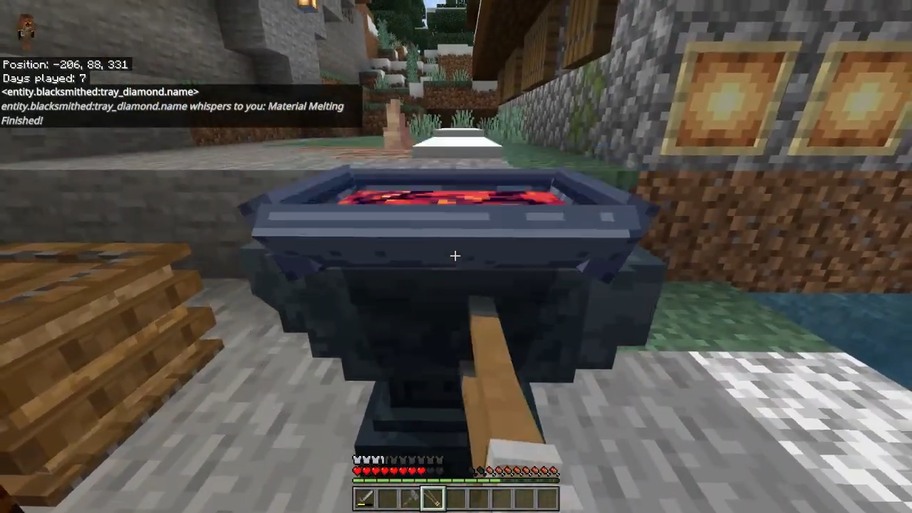 BlackSmithed Addon (1.21) adds a crafting system with manual steps. The process begins with building a forge and using a blowtorch to heat the charcoal blocks. The metal is placed in a tray and heated over the fire until completely melted. The molten metal is then transferred to an anvil to select the desired weapon or armor.