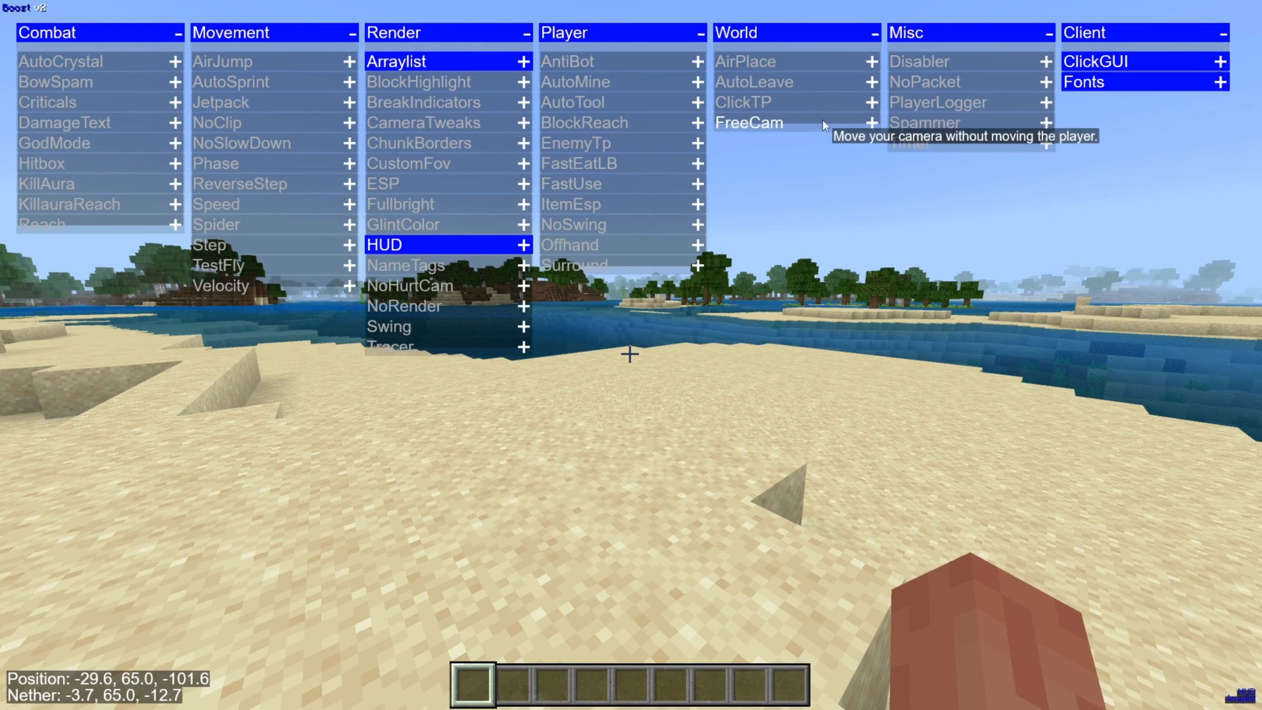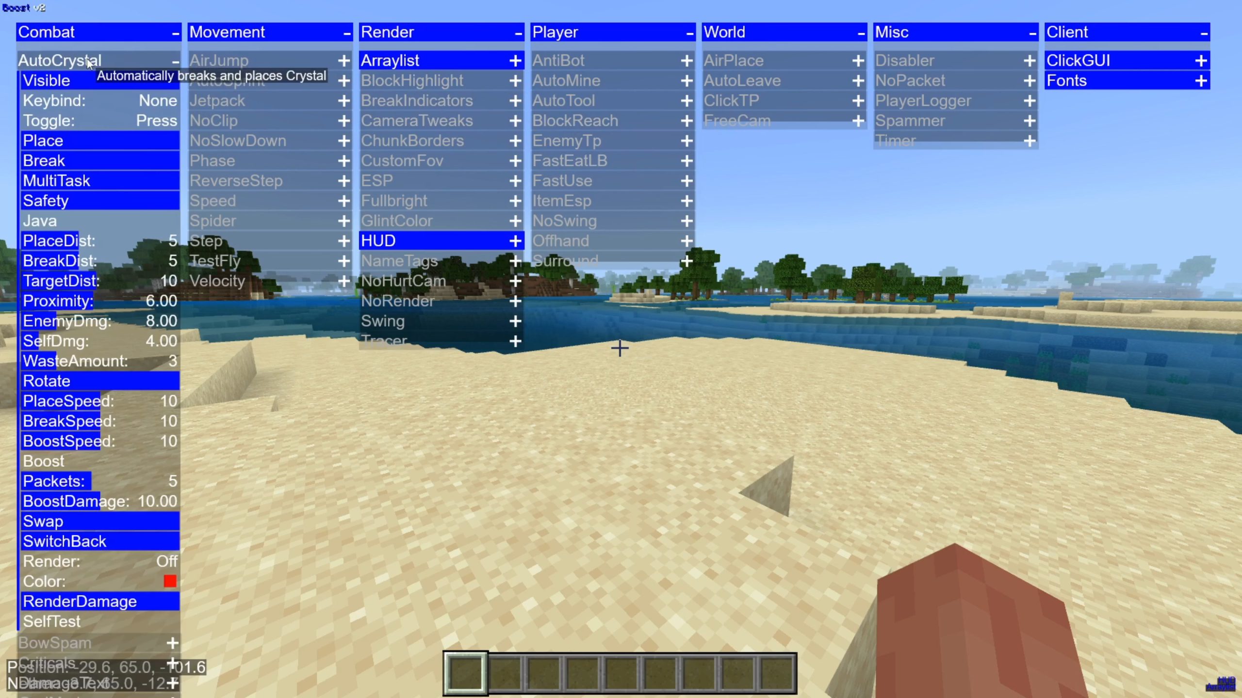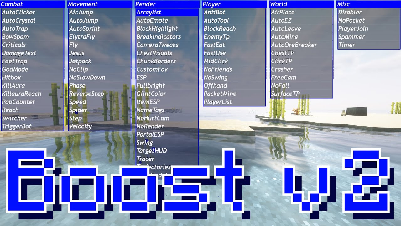 Boost Client (1.21) is a private and public hack client (also known as a utility mod or cheat client) designed specifically for the PvP aspect, with the latest version featuring auto-clicker, auto-trap, god mode, fly, auto-mine, auto-leave, and more. This client may be banned on many servers. Download this at your own risk.