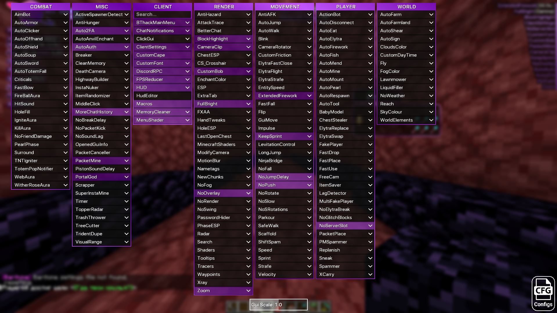 Speed,LongJump,ElytraFlight,Strafe,NoSlow, andSafeWalk. - Optimized for fast travel and exploration on large anarchy maps.