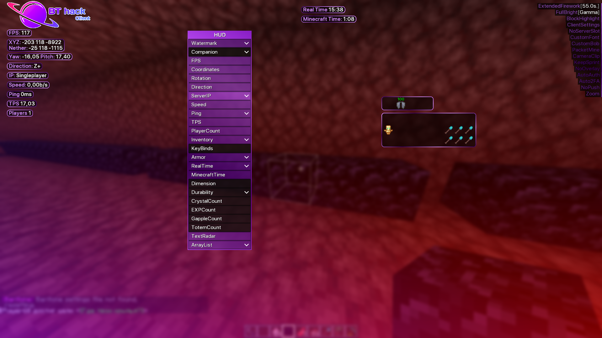 BThack Client Mod (1.21.4, 1.21.1) is a free, open-source PVE cheat client designed for Minecraft anarchy servers. It includes over 150 modules to enhance gameplay and features a plugin system for customizing modules, commands, HUD elements, categories, and client behavior.