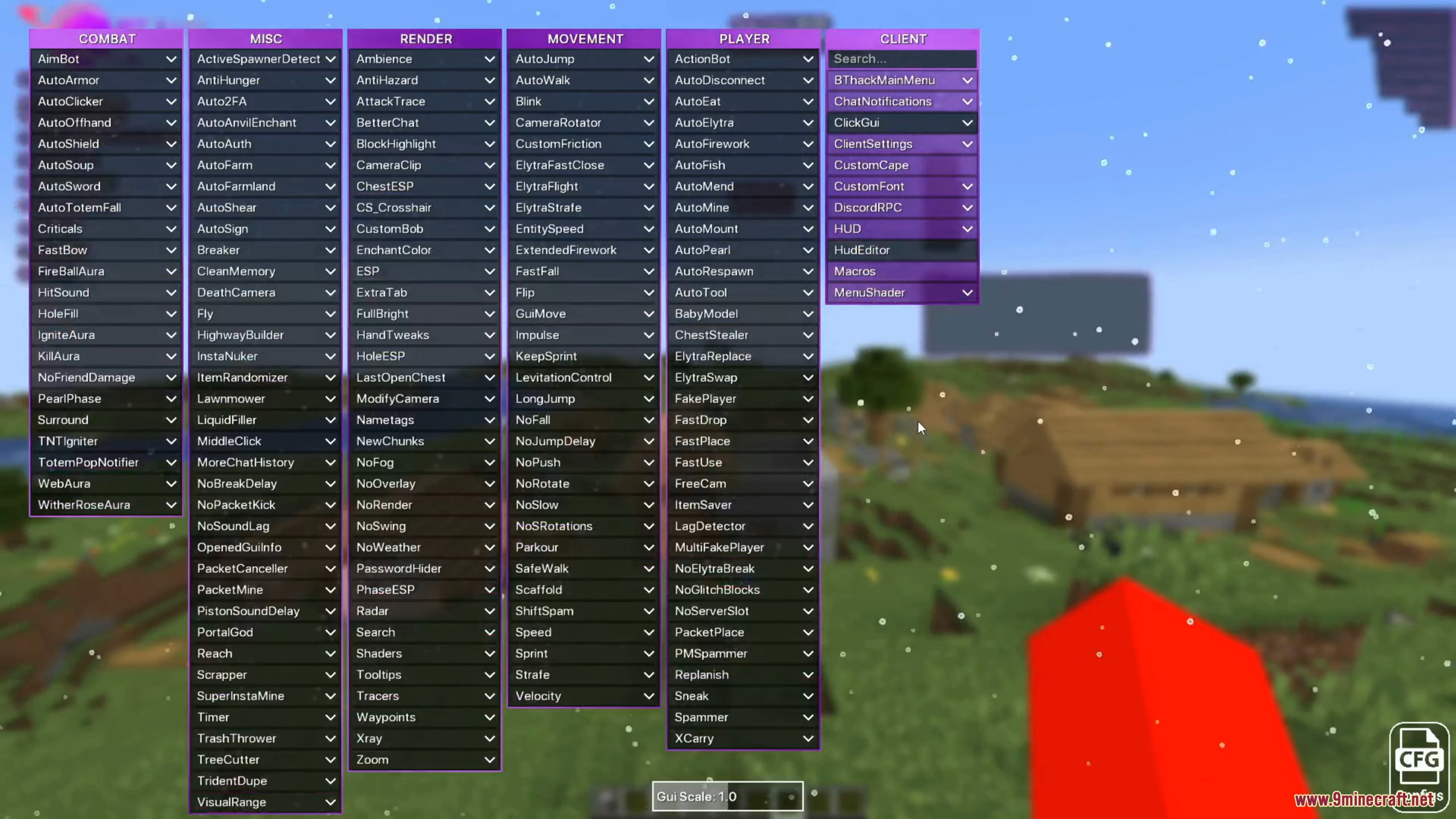 FullBright,NoFog,Xray,CustomShaders, andZoom.