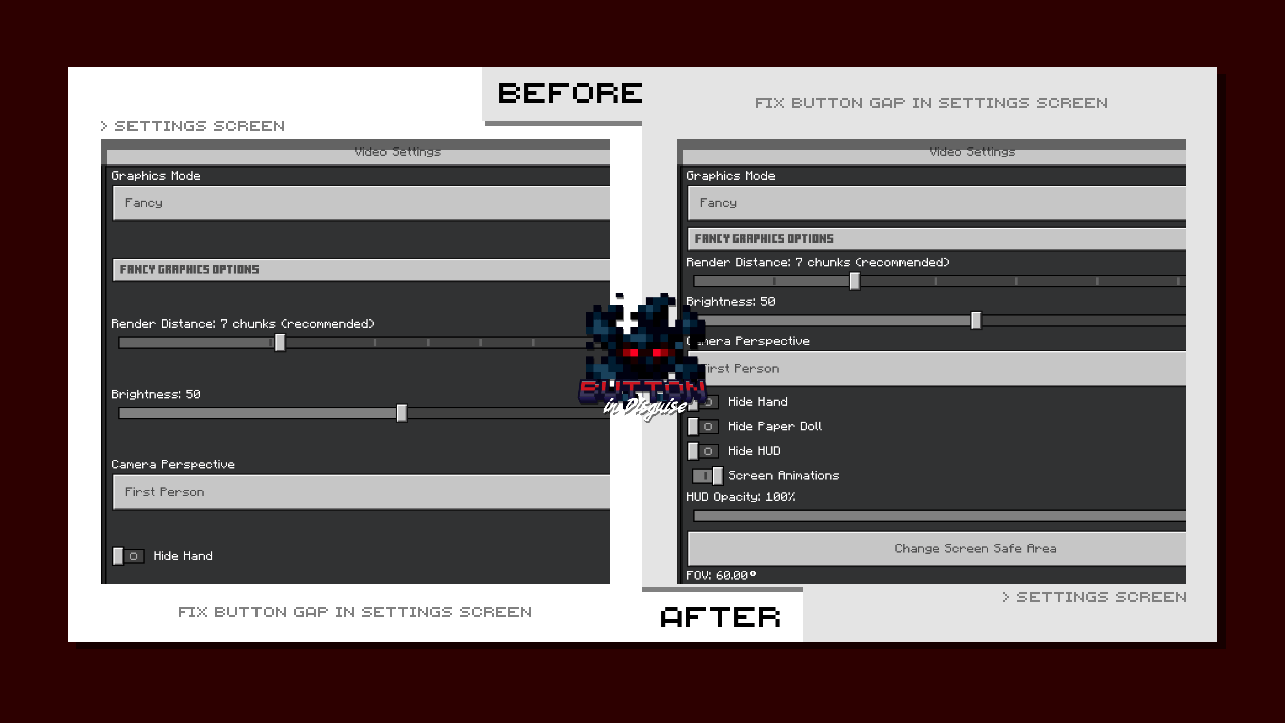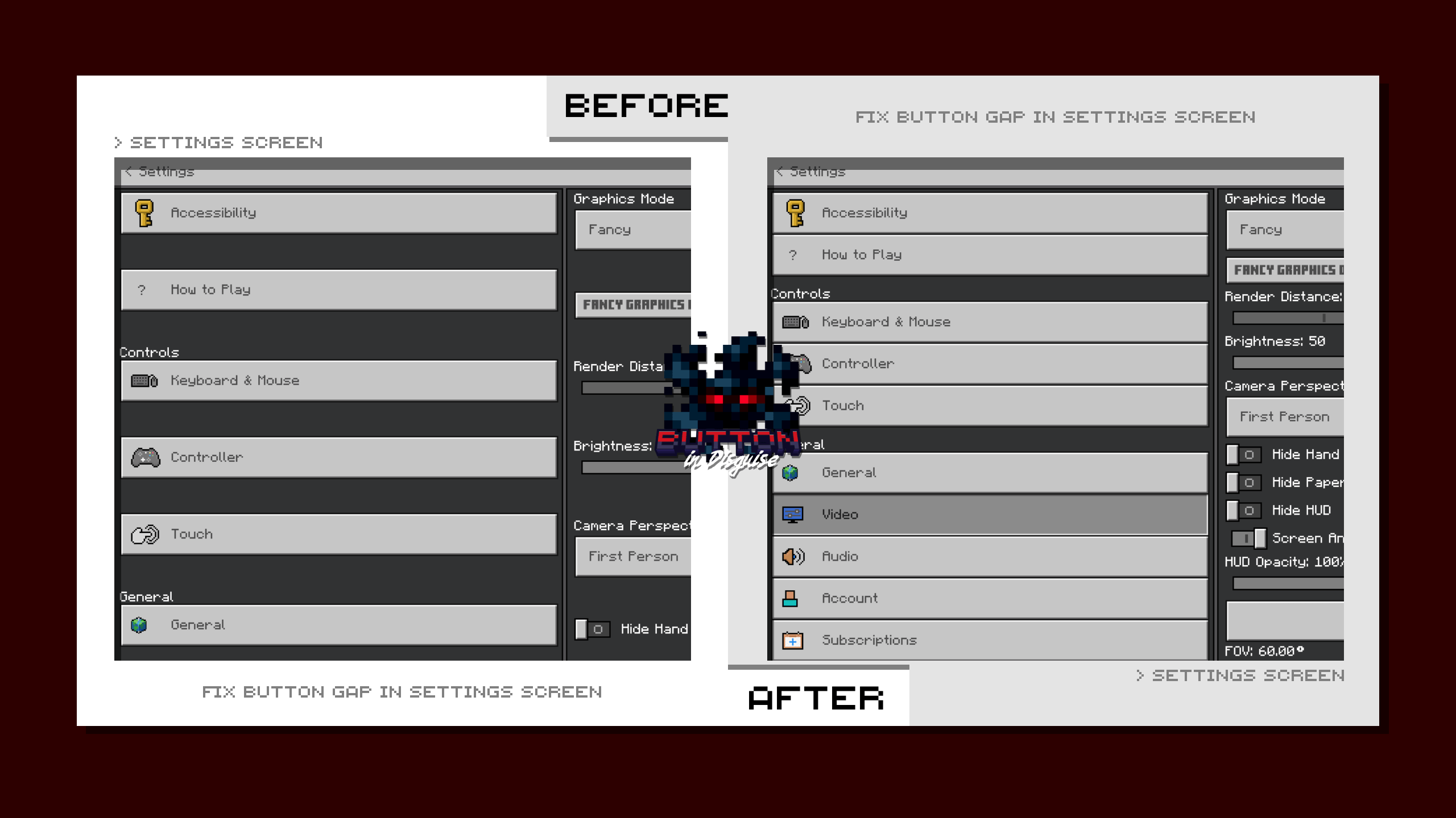 Button in Disguise Texture Pack (1.21, 1.20) focuses on changing the buttons in the game interface. Resource packages are broken down to reduce storage space. Key features include restoring the old settings interface, fixing button spacing, and displaying hidden buttons. Players can return to the control interface, tap, or save a previous version using the corresponding buttons.