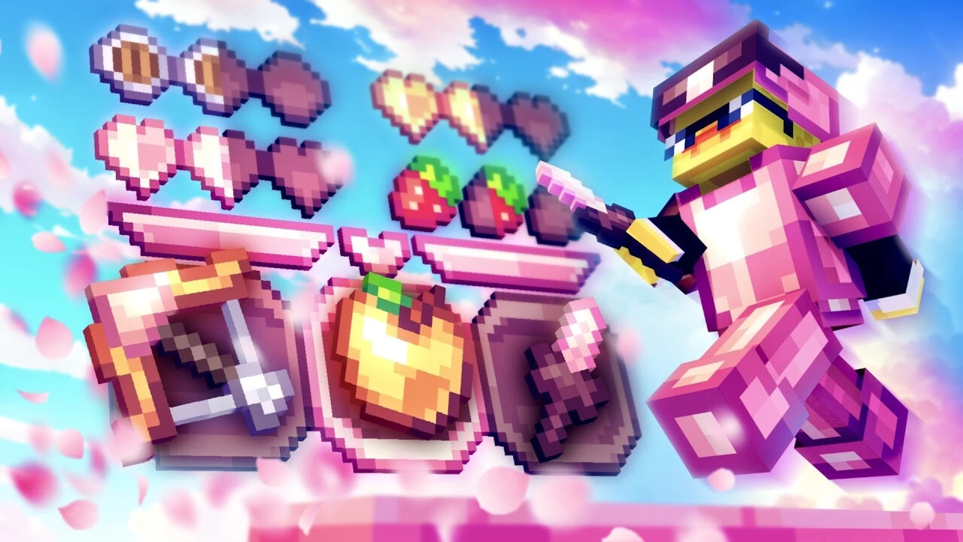 Caritas Texture Pack (1.21) changes the visuals to a Valentine’s Day theme with a pastel pink color scheme. The 16x resolution details create a simple interface and square blocks. The dominant color throughout is light pink.