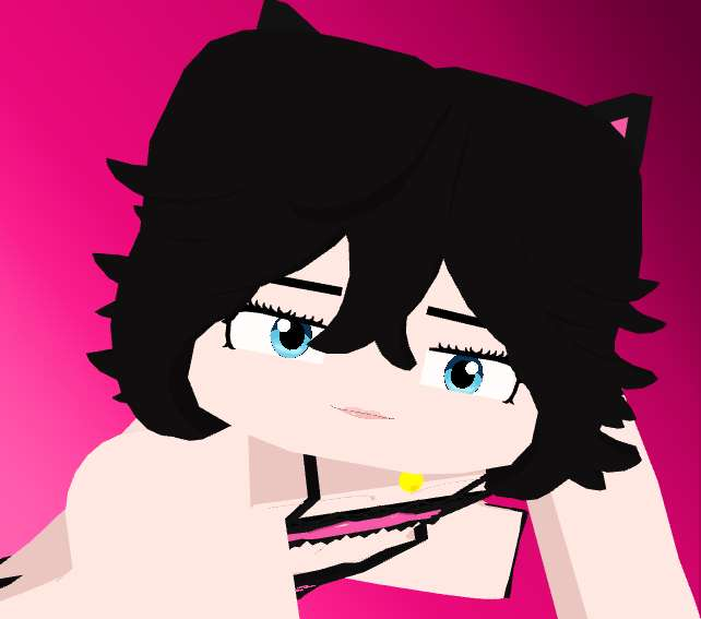 Cat Robin Jenny Mod Model features shaggy black hair framing face, piercing blue eyes, perky black cat ears, implied fluffy tail; pale skin, minimal black straps (fanservice harness), prominent gold bell on pink ribbon collar for jingle SFX/tease.