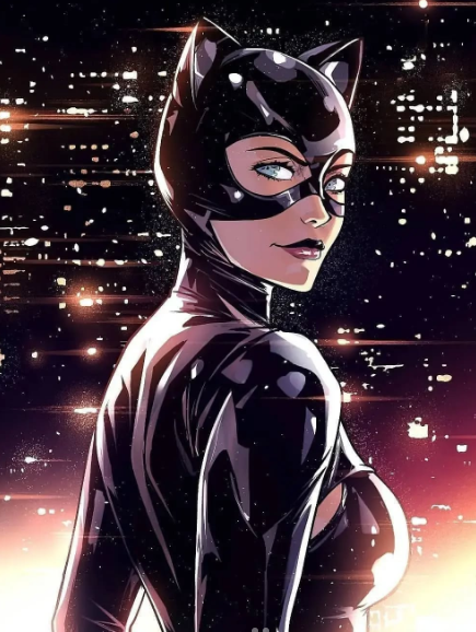 Catwoman Jenny Mod Model inspired by the iconic DC Comics character (Selina Kyle), a seductive cat burglar known for her black leather catsuit, cat ears, whip, claws, and agile, feline-inspired persona.