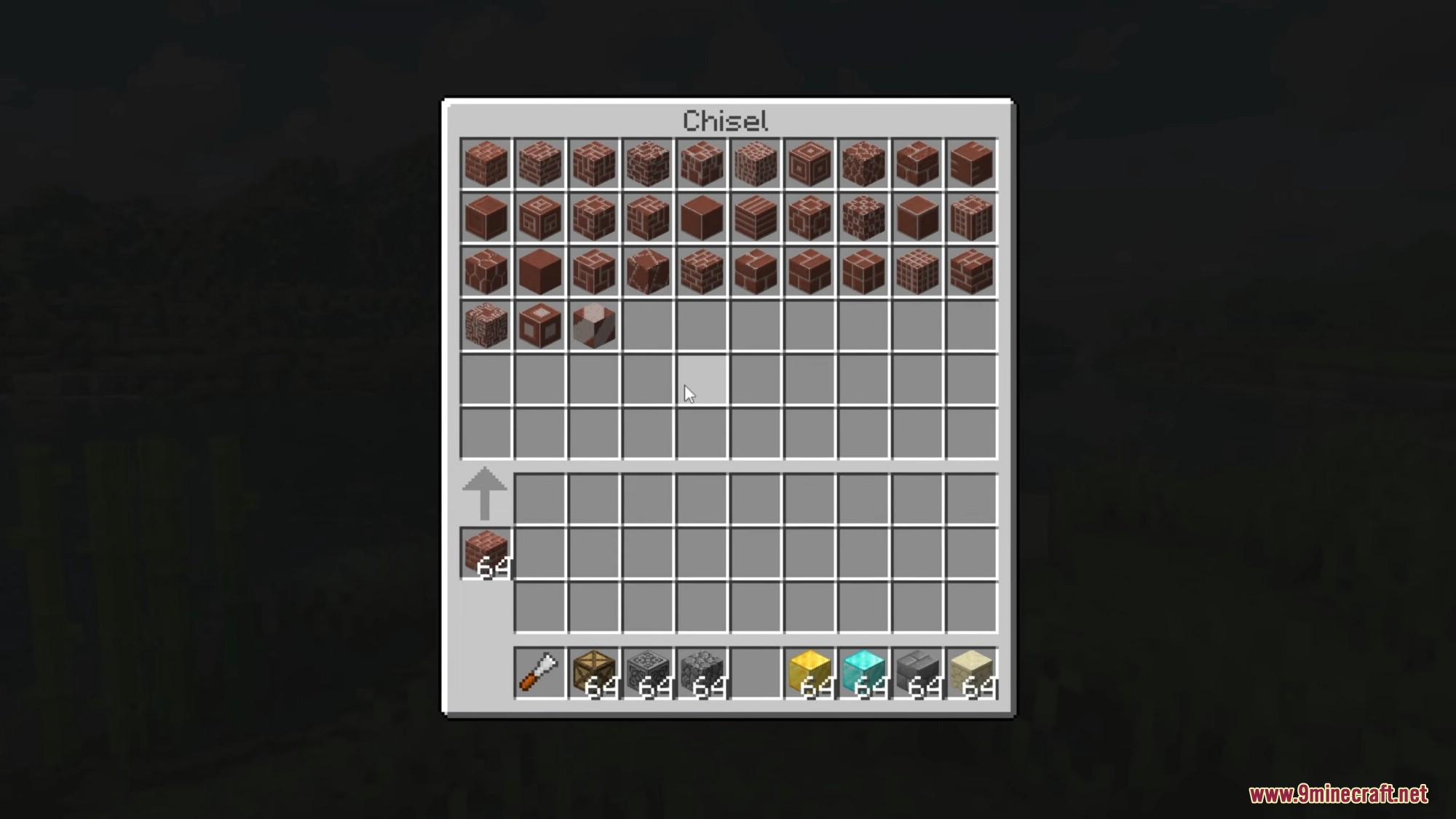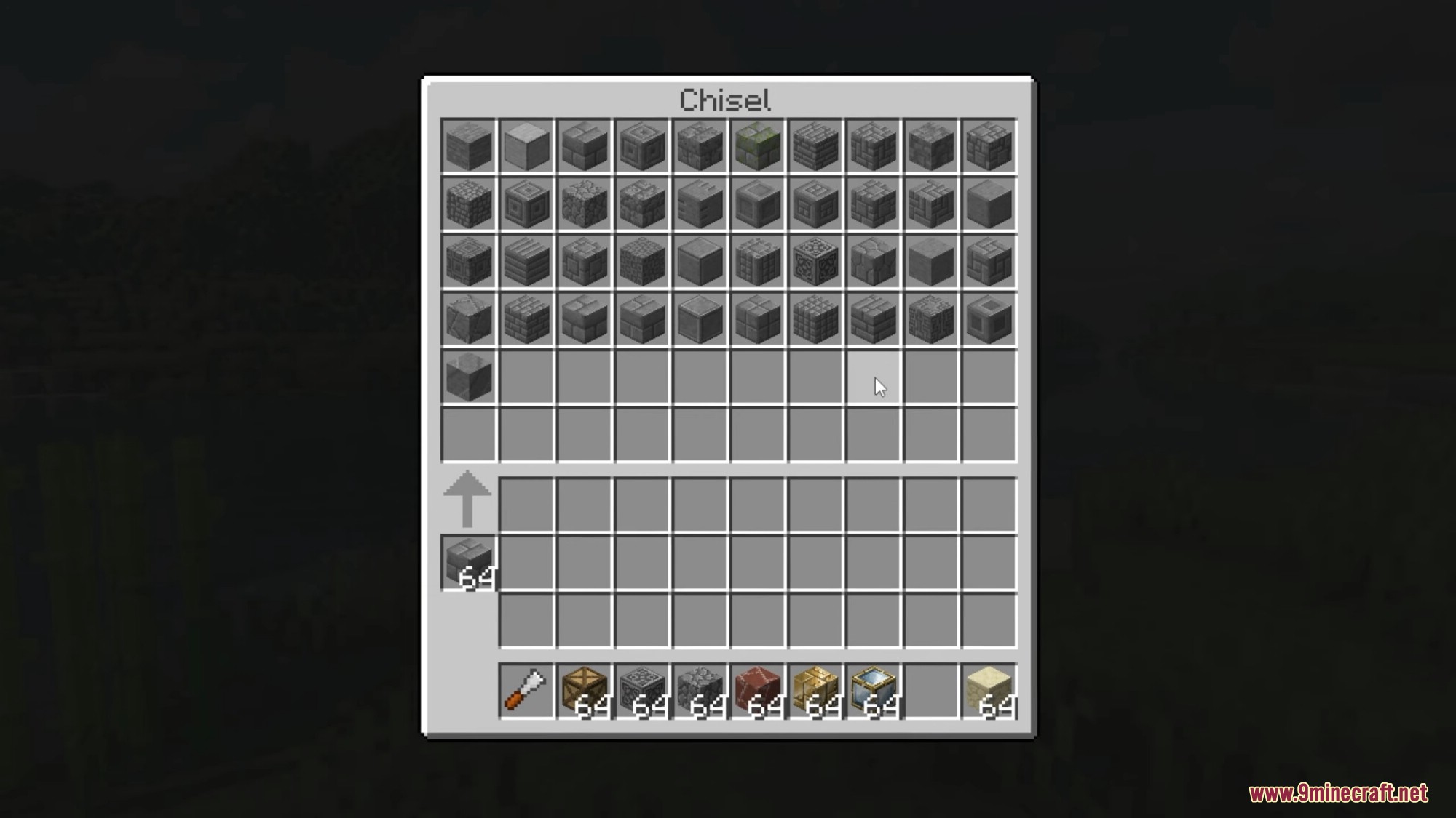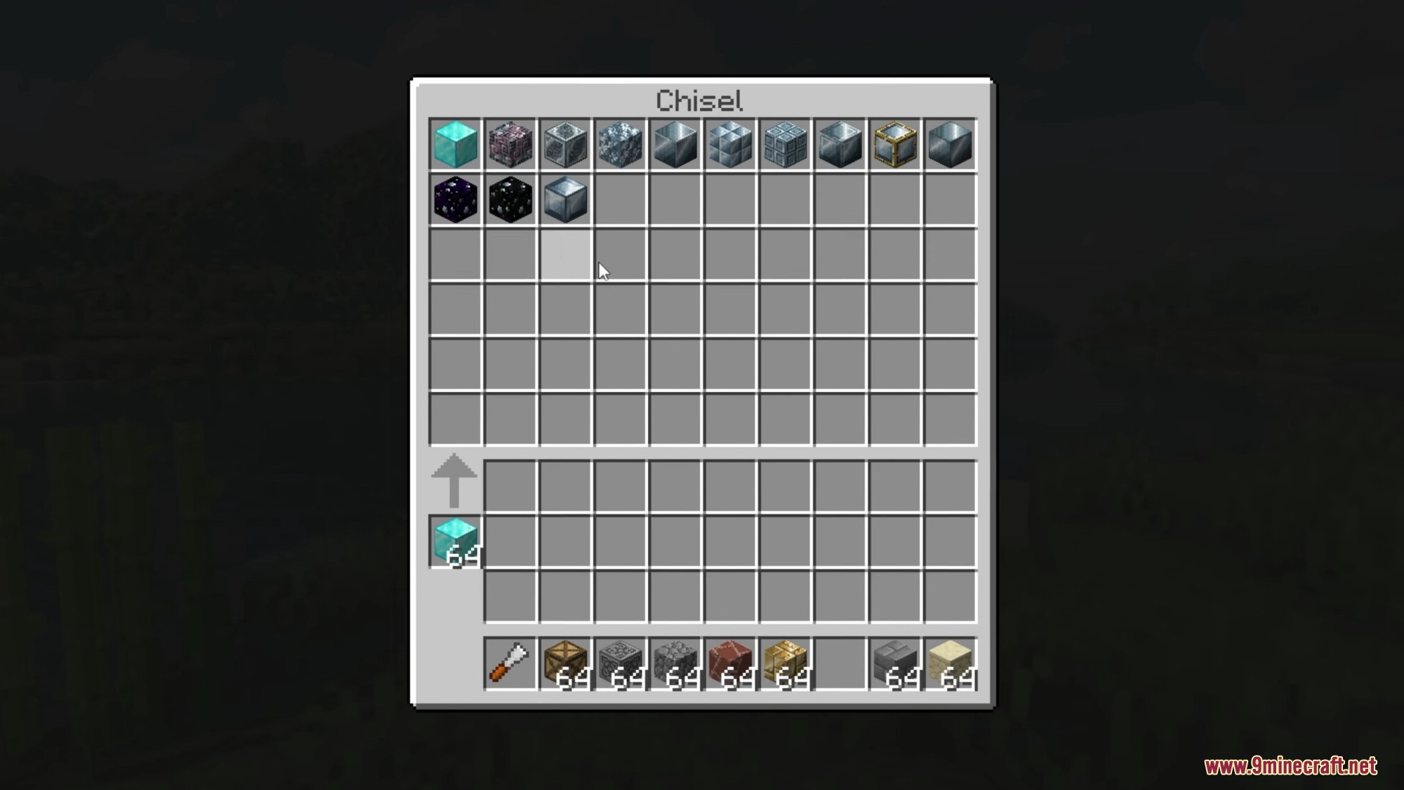 - Open GUI by right-clicking with a Chisel. Place the block(s) to be chiseled in the central slot to display available variants.
