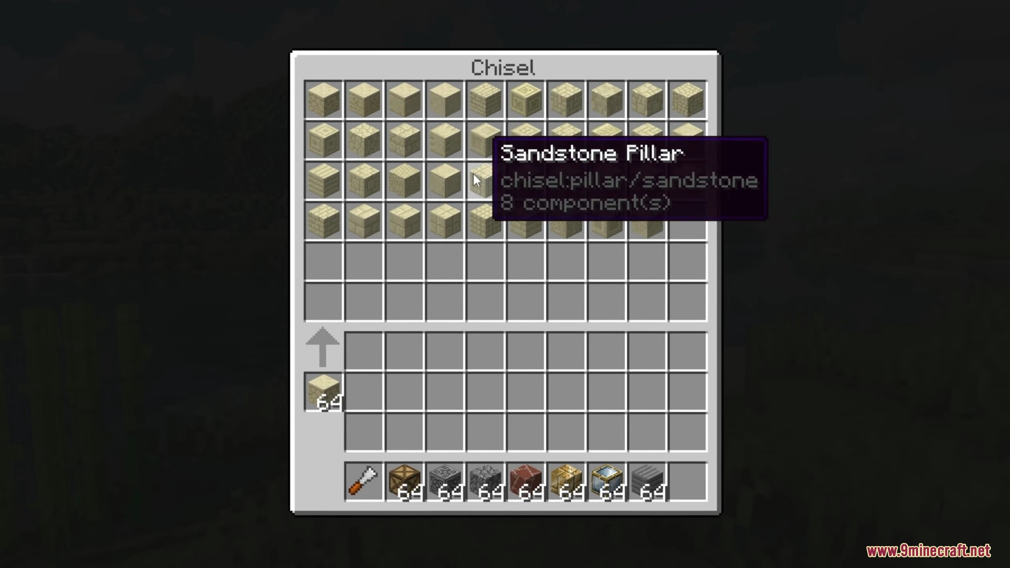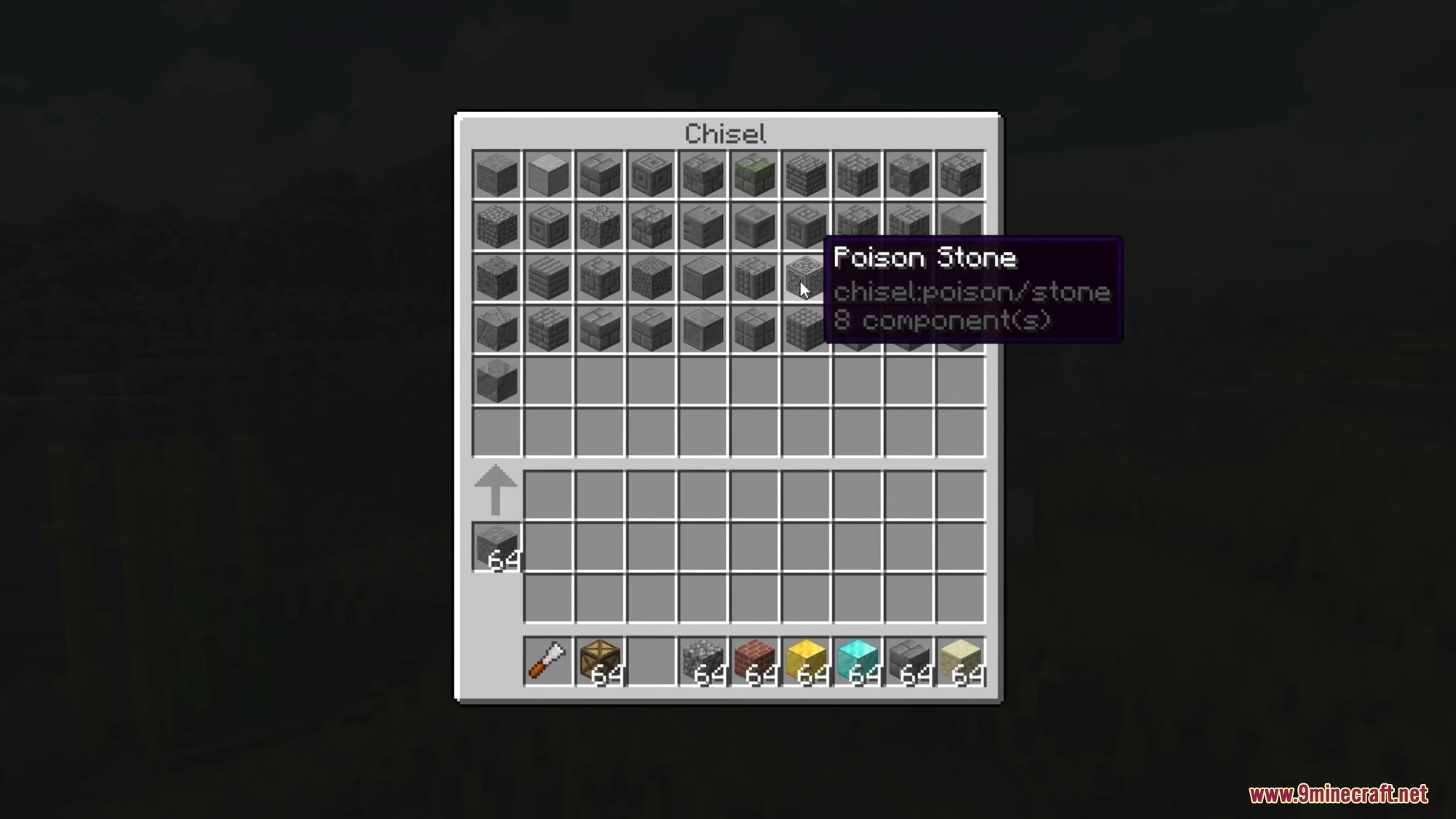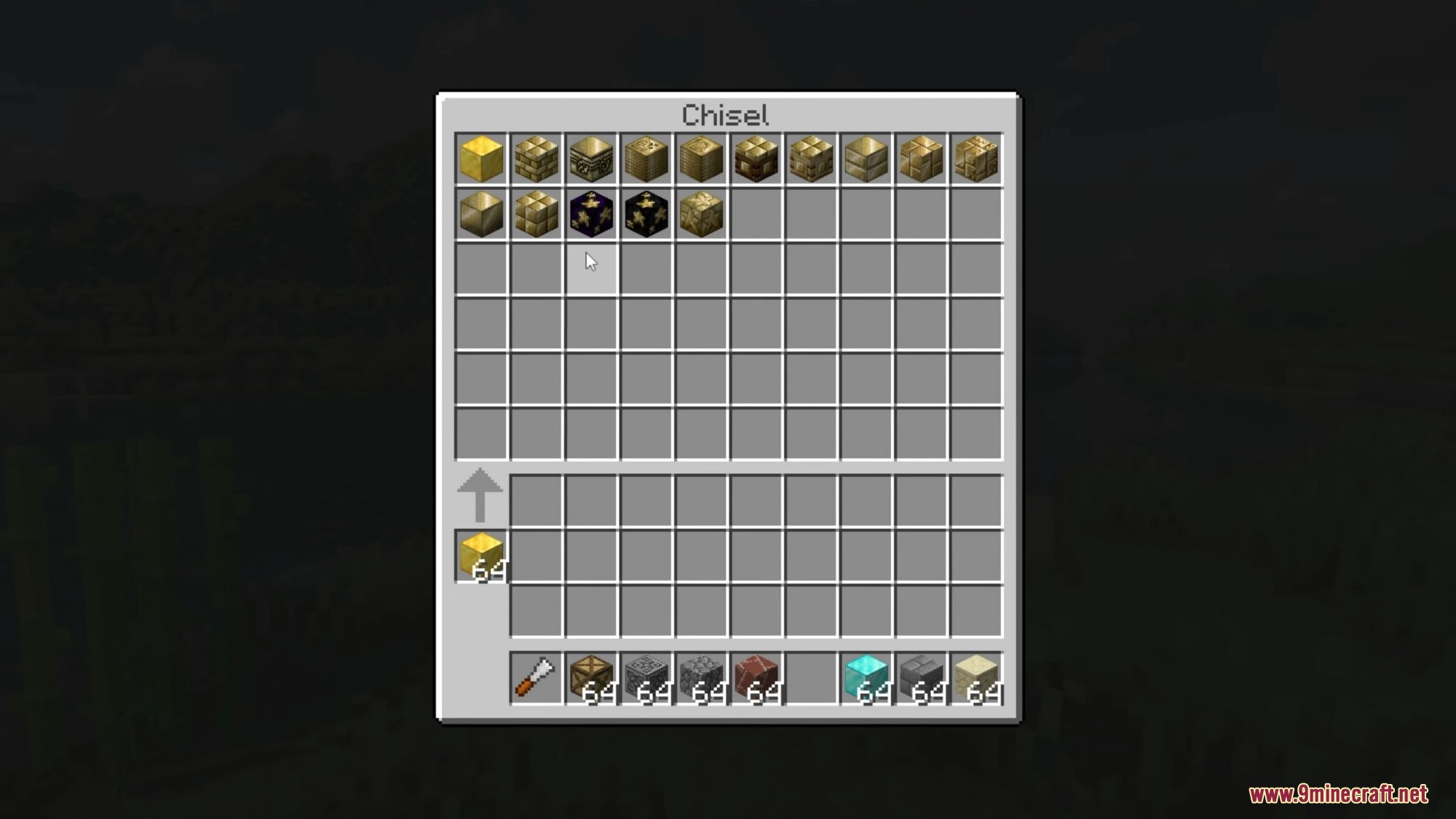 - Open GUI by right-clicking with a Chisel. Place the block(s) to be chiseled in the central slot to display available variants.