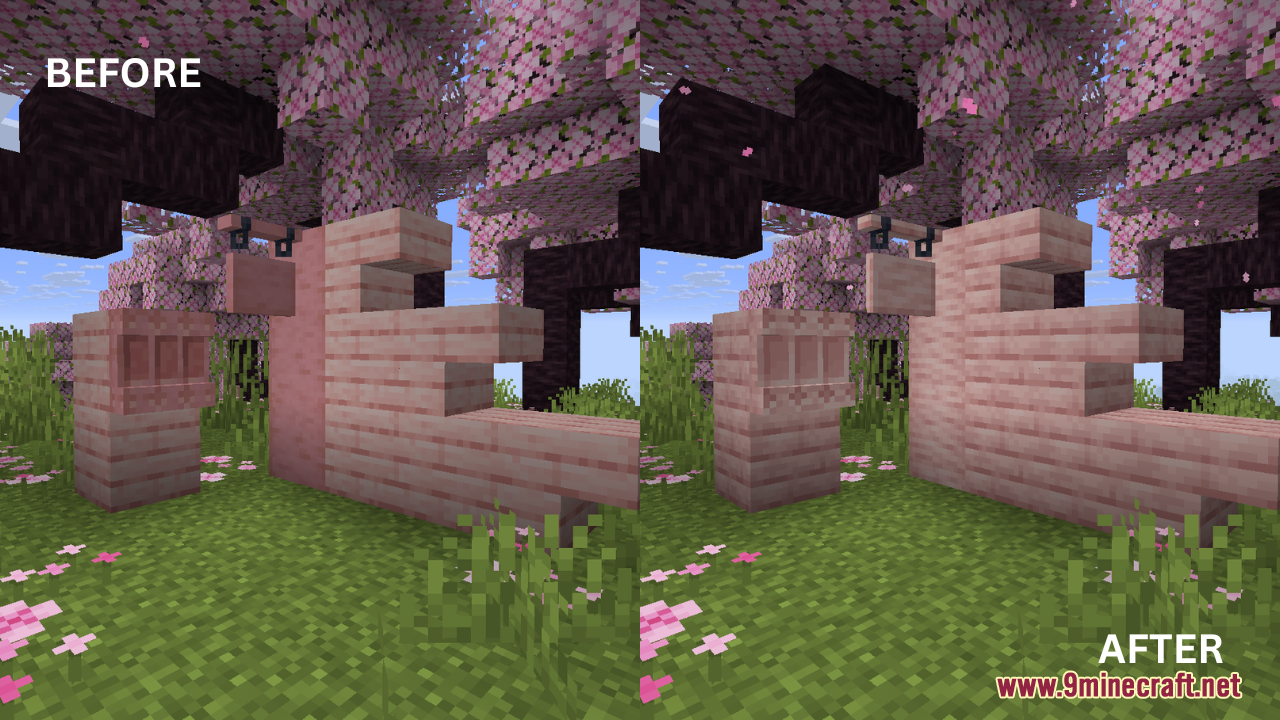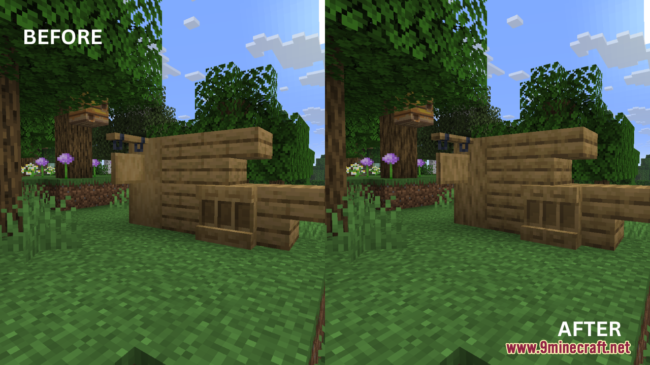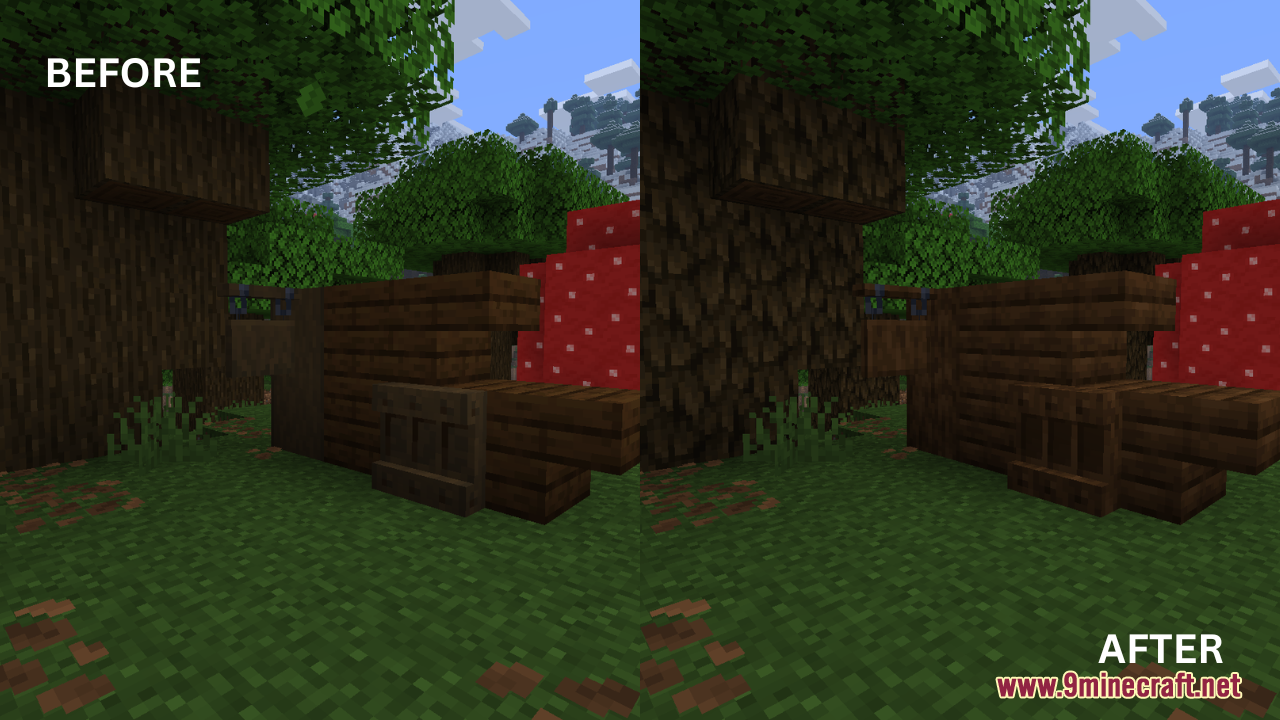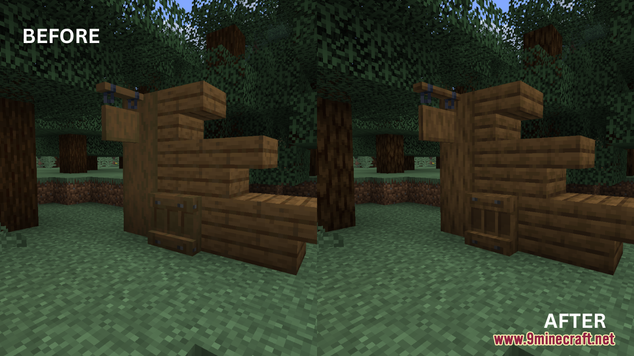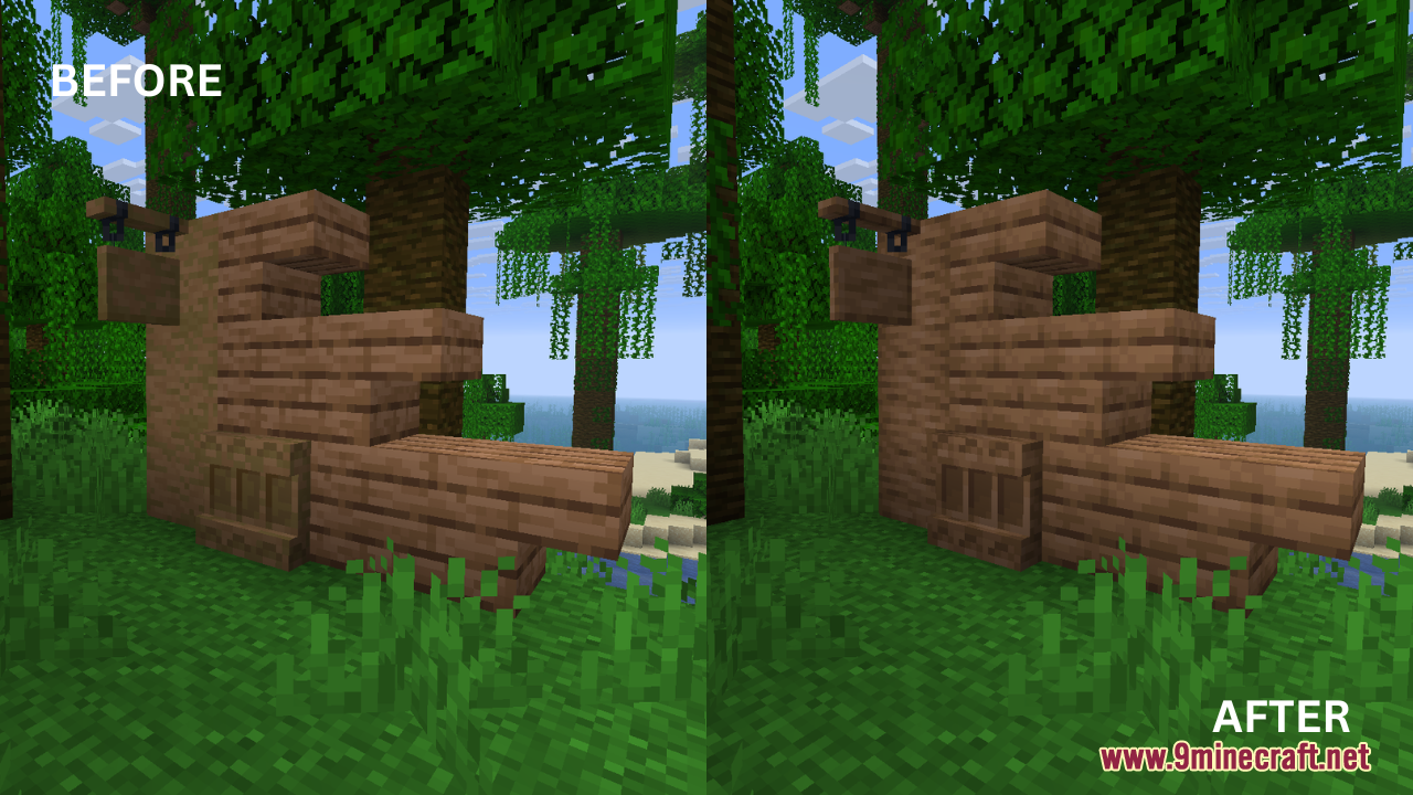 Choppy Wood Resource Pack (1.21.11, 1.20.1) refreshes and improves the visual consistency of almost all wood-related blocks in the game, giving logs, planks, hanging signs, boats, and shelves updated textures that match better with each other and look more cohesive overall. It enhances the appearance of wooden materials without changing their function, making builds that use wood look cleaner, more unified, and visually appealing. The pack also supports compatibility with other texture packs like Fancy Fences, Creaky Doors, and Pixel Consistent Signs, so it can easily slot into a larger texture setup. Choppy Wood is great for players who want subtle but noticeable wood texture improvements that help unify and polish their builds while keeping performance lightweight and the vanilla feel intact.