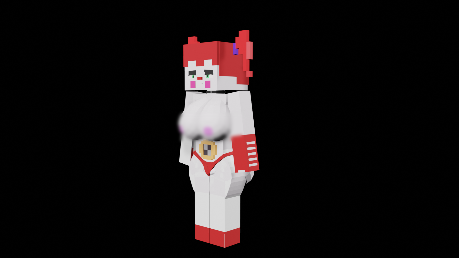 Circus Baby Ellie Jenny Mod Model adapts Baby’s clownish animatronic design with pale porcelain skin, rosy cheeks and green eyes, red pigtails topped with blue ribbons and bunny ear accents, a red bowtie and striped limbs, a gold-striped belt, and white lingerie.