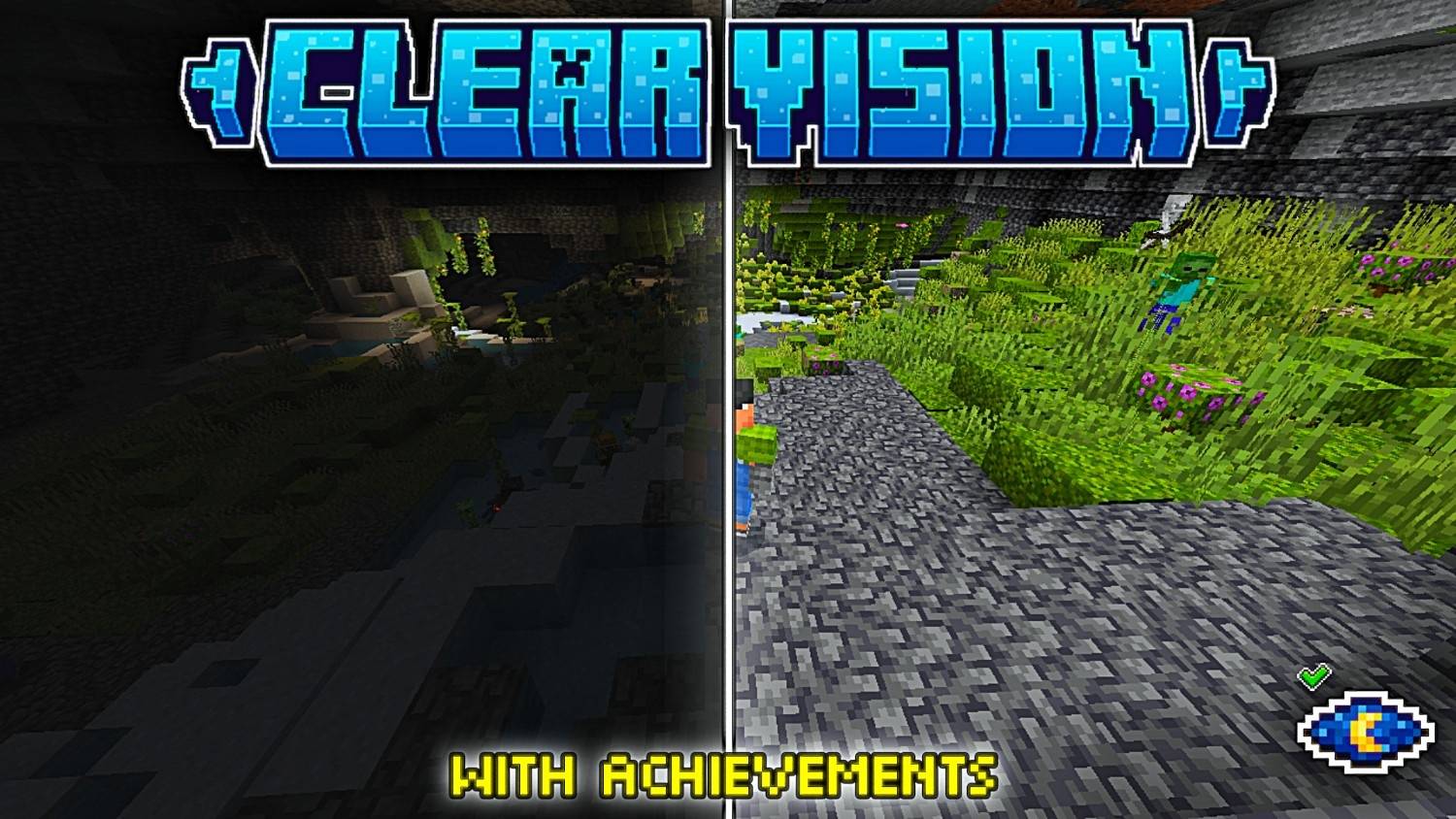 Clear Vision Addon (1.21) provides permanent night vision (like a fullbright effect) so you can see clearly in dark areas such as caves, underground, or at night-without needing potions, commands, or any setup. Just activate the addon pack in your world, and it works automatically in survival mode.