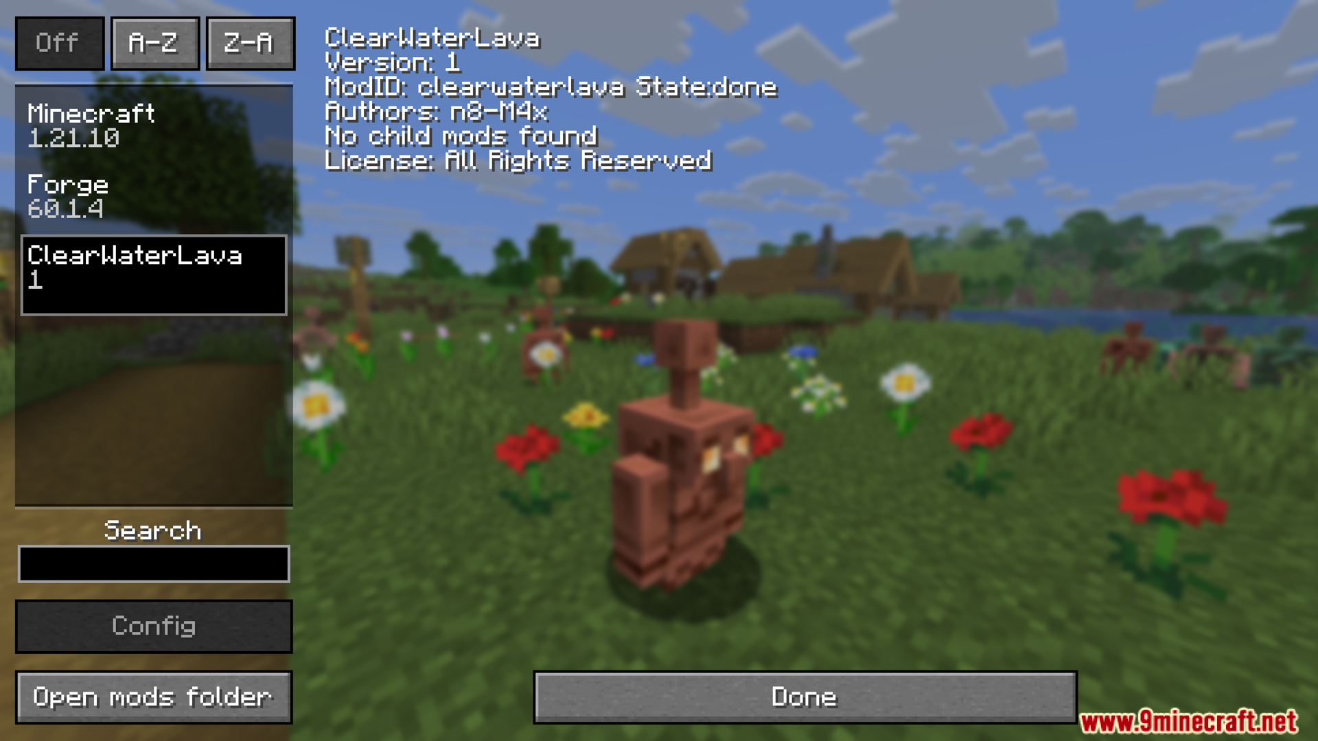 Clear Water Lava PowderSnow Mod (1.21.10, 1.20.1) is a simple mod that helps you see clearly underwater, in lava, or in powder snow. This mod is useful when you need to dive deep underwater, mine the Nether in lava, or move through powder snow without your vision being obscured.