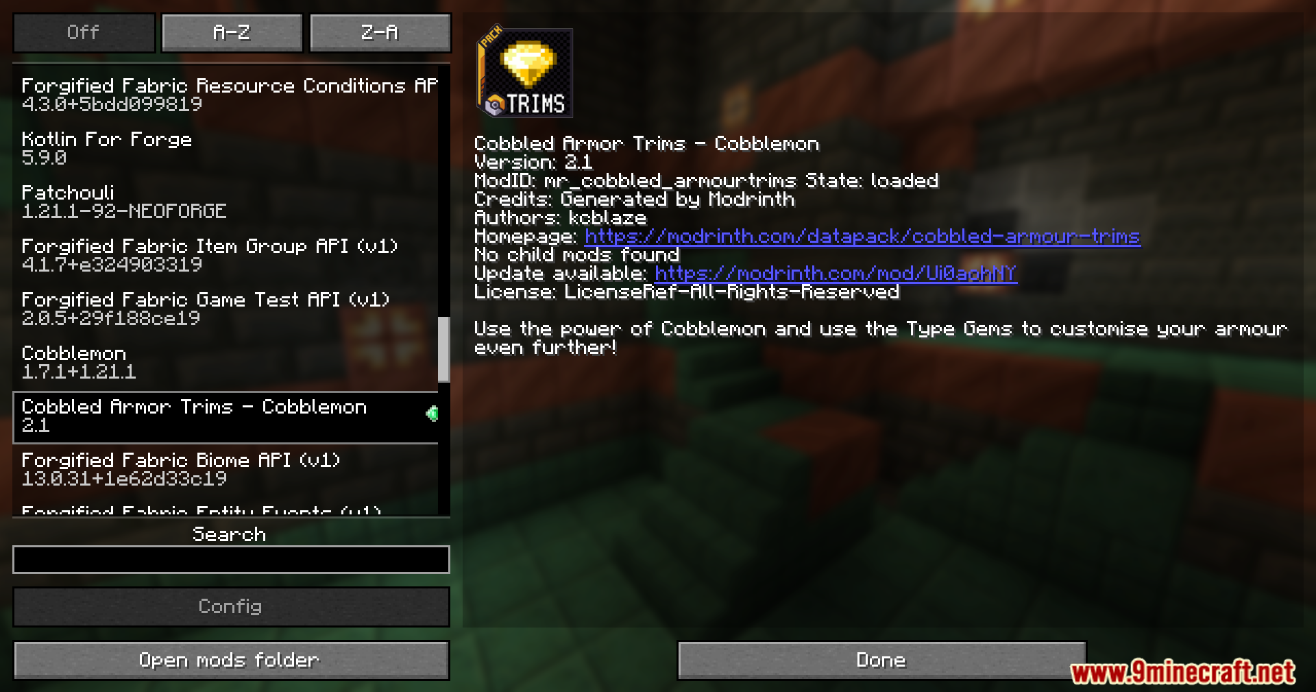 Cobbled Armor Trims Mod (1.21.1, 1.21) permit you use Cobblemon Type Gems as armor trims, adding type-themed customization to your gear for extra visual identity.