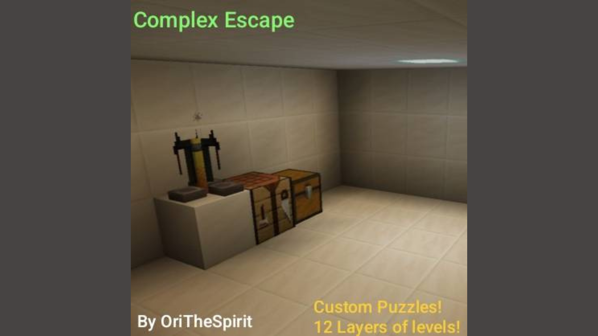 Complex Escape Map (1.21) is a puzzle map to escape the room. The character is imprisoned in a secret laboratory for testing because of the unusual jumping ability. When everyone is sleeping and there are only two hours left before being discovered, the mission is to solve all the puzzles to unlock the exit and escape before it is too late.