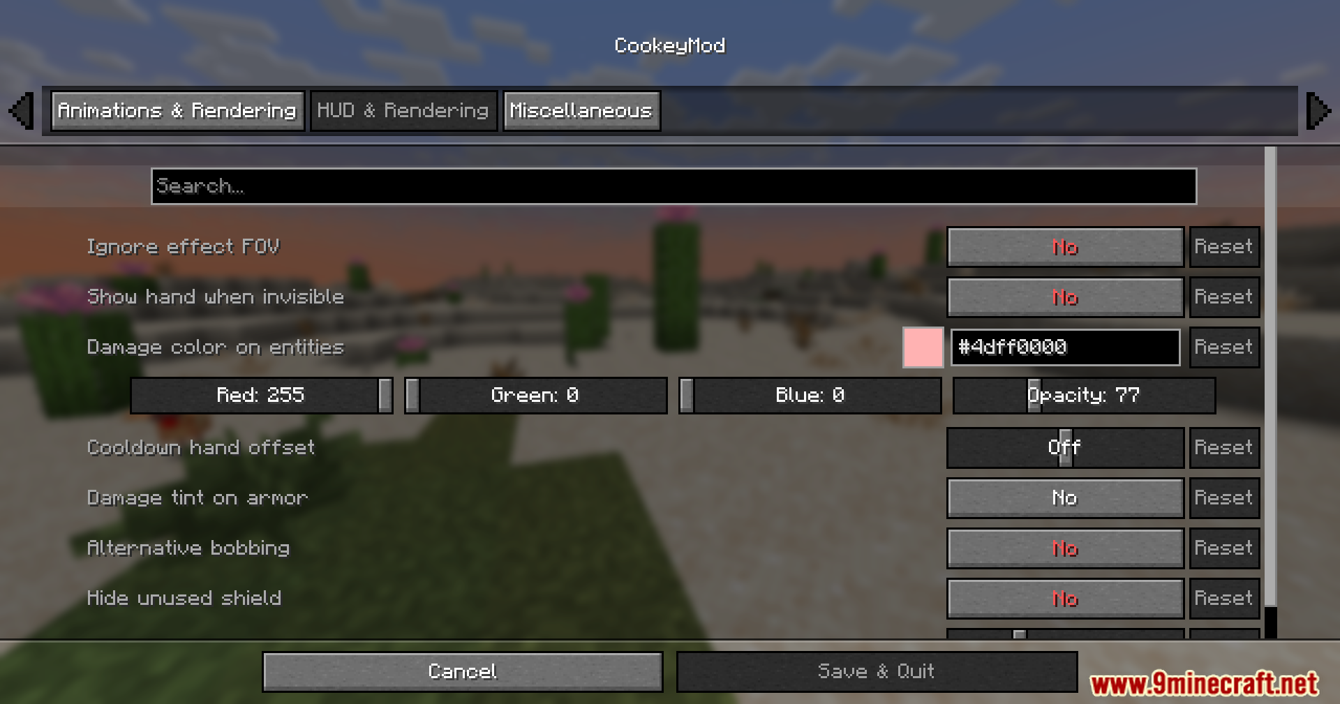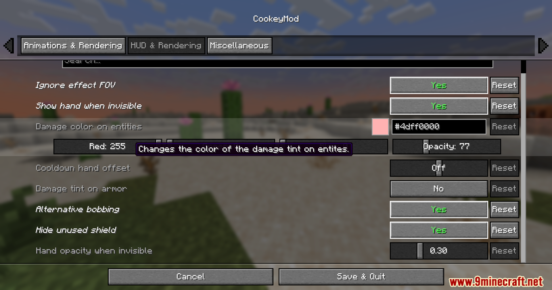 - Visual tweaks including damage tint color, armor damage tint, alternative bobbing, and hidden unused shields.