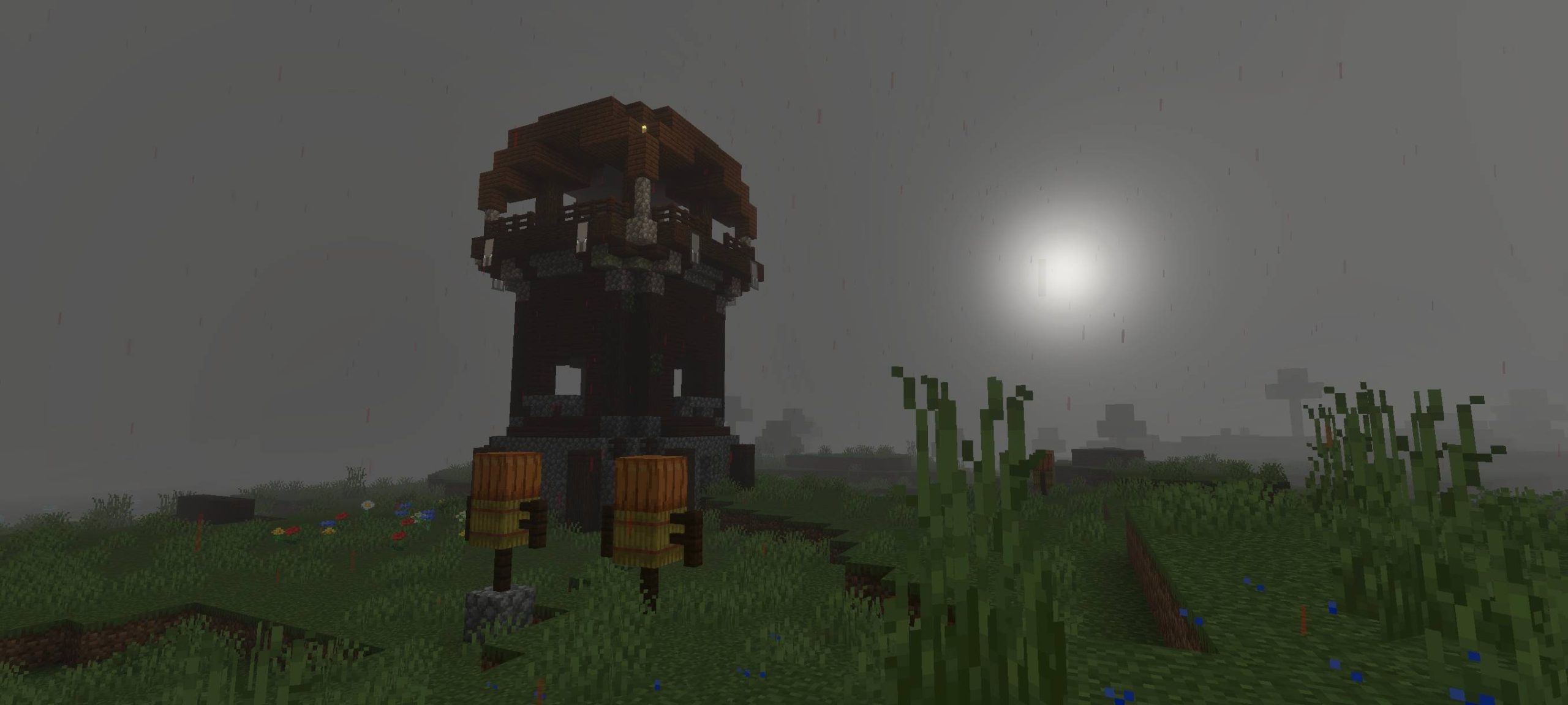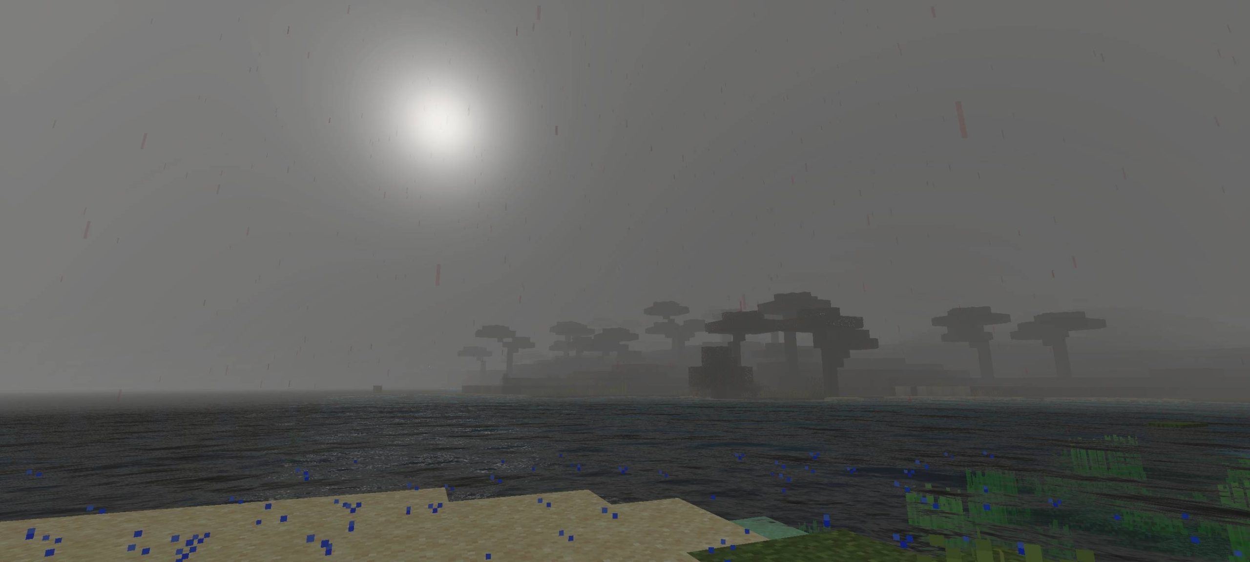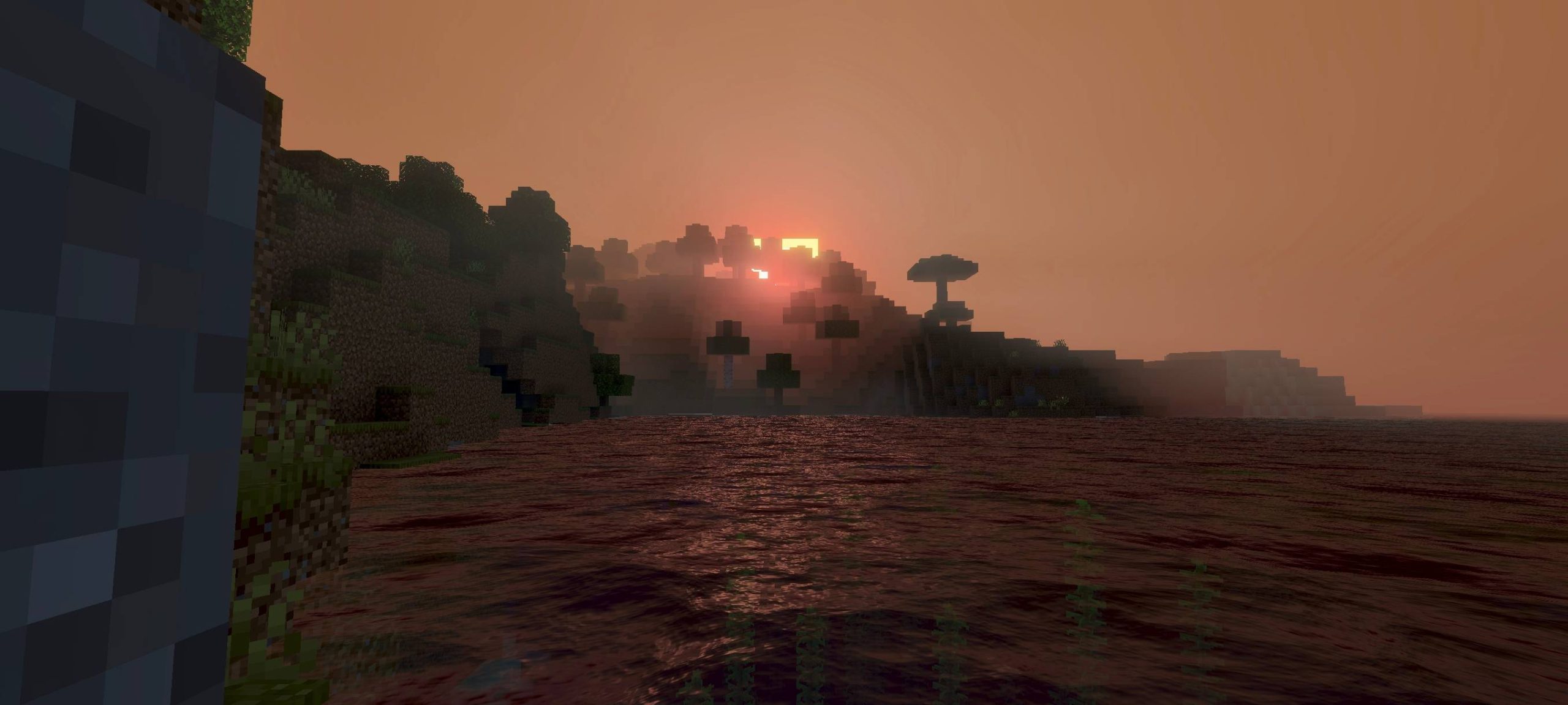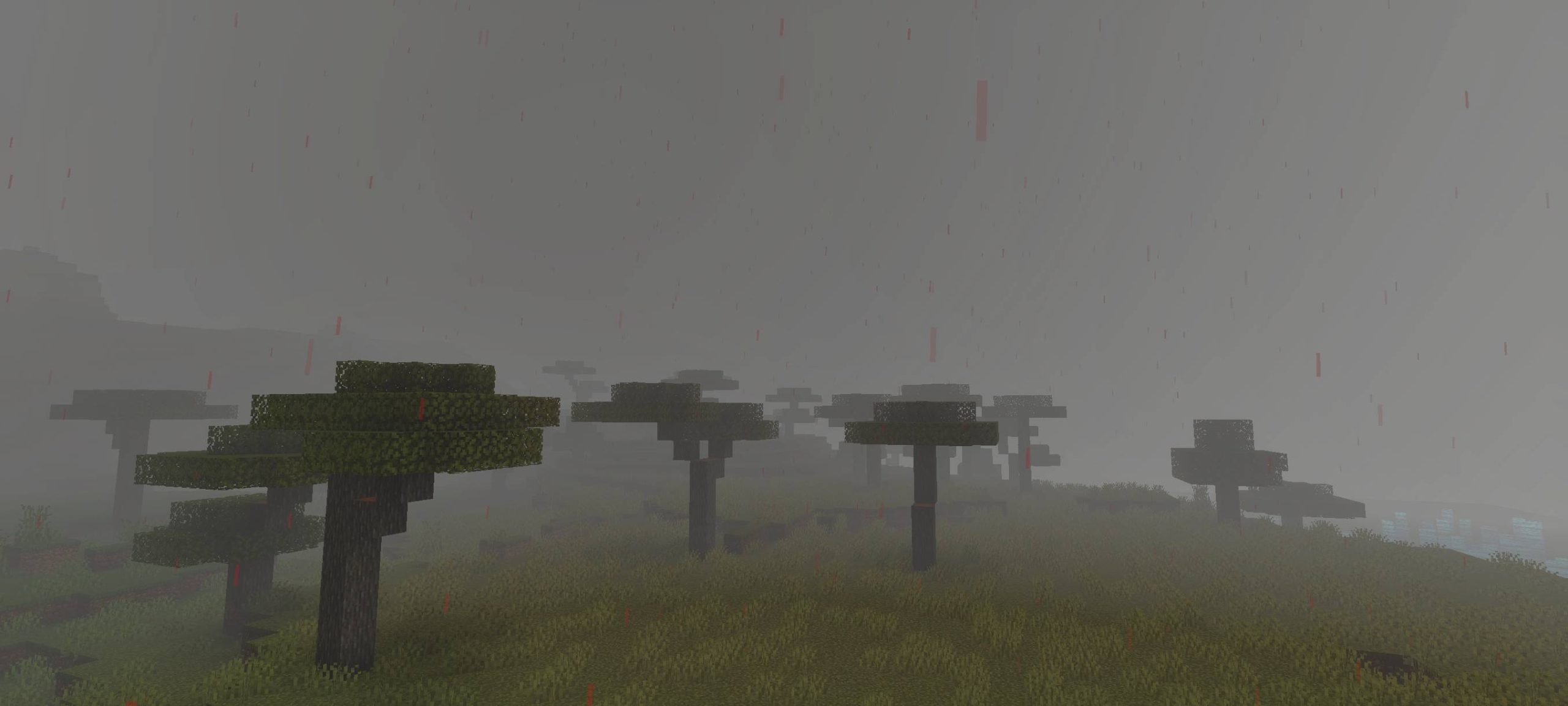Creepypasta Shader (1.21) shifts its visuals toward a dark and horror-inspired theme reminiscent of Silent Hill. The sky turns gray, creating a somber and tranquil atmosphere. Phenomena like blood rain and a blood moon enhance the creepiness of nighttime monster hunts. These changes give the game a distinctly horror feel with its dim and gloomy setting.