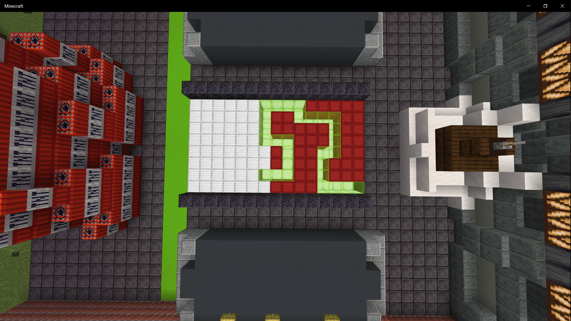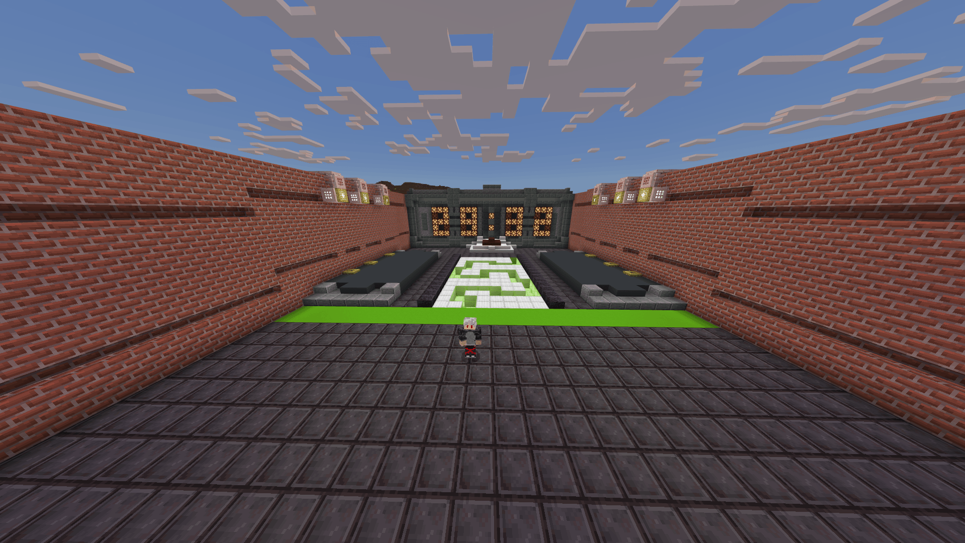 Cross The Tile Map (1.21, 1.20) requires memorizing the green tiles on the floor to move to the other side. These tiles only appear once before disappearing completely. The objective is to follow the correct path and press the button to detonate the TNT explosives within 30 minutes to save the village. If time runs out, the village will be blown up. The system allows replays with randomly changed paths. The challenge area features a countdown timer and command blocks that determine win or loss outcomes.