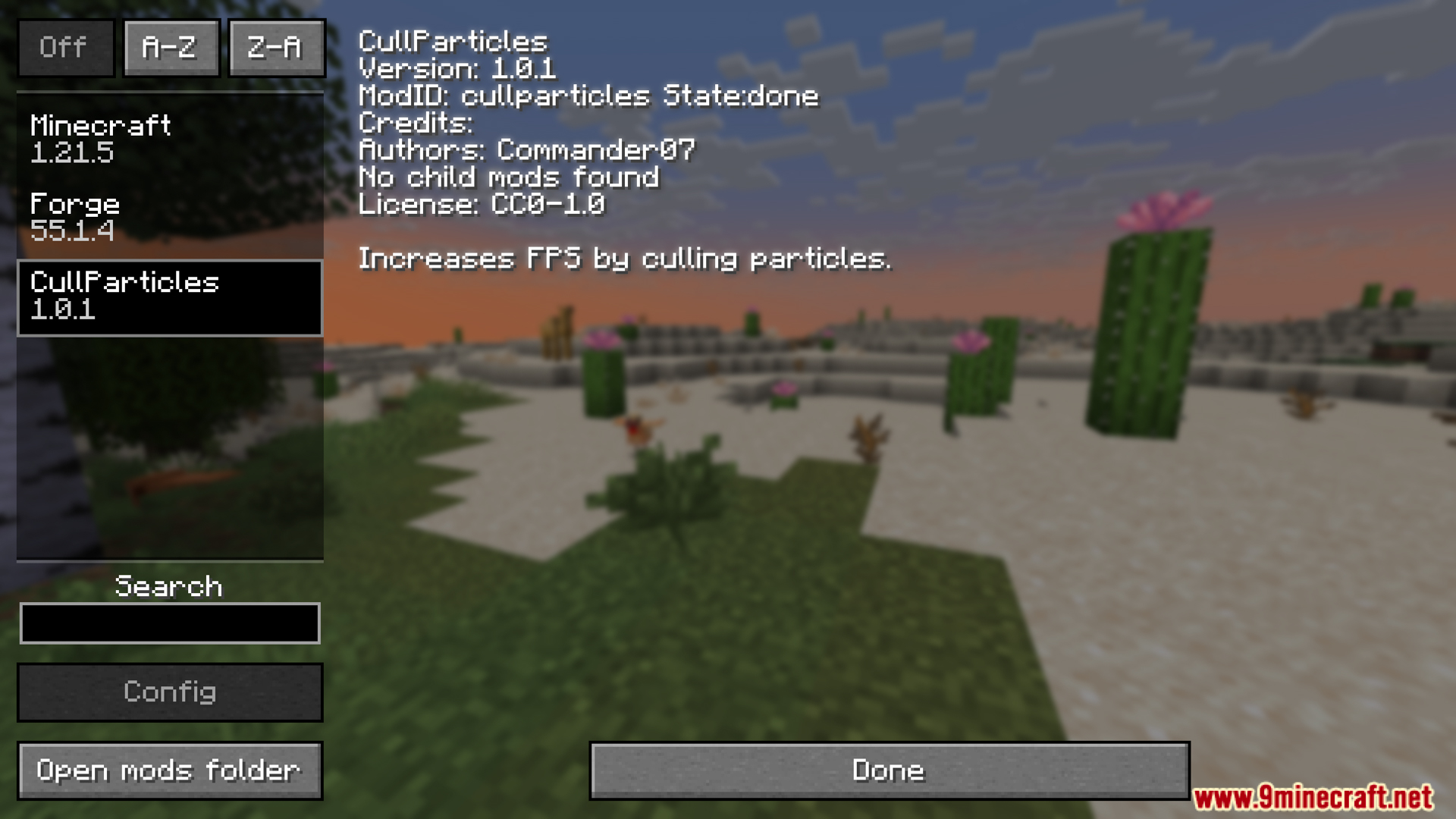 - This mod disables the display of particles invisible to the player to reduce GPU load, significantly increasing FPS and smoothness in areas with many particles.