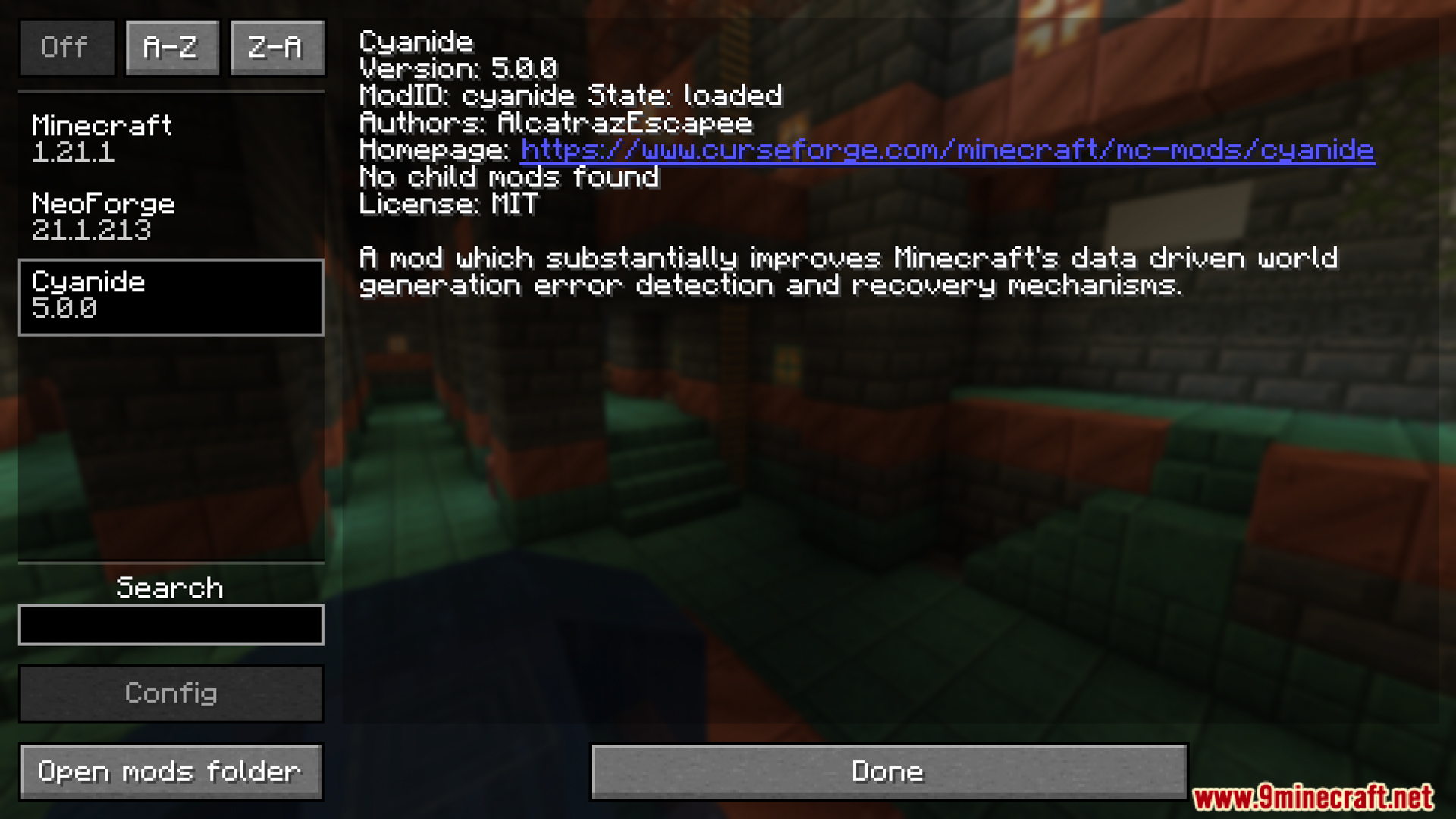 Cyanide Mod (1.21.1, 1.20.1) is a mod that improves worldgen datapack errors by replacing confusing stack traces with detailed error messages. It pinpoints the exact file, datapack, and location of the error, allowing datapack creators to quickly fix common issues like negative values, invalid JSON, feature cycles, or missing files.