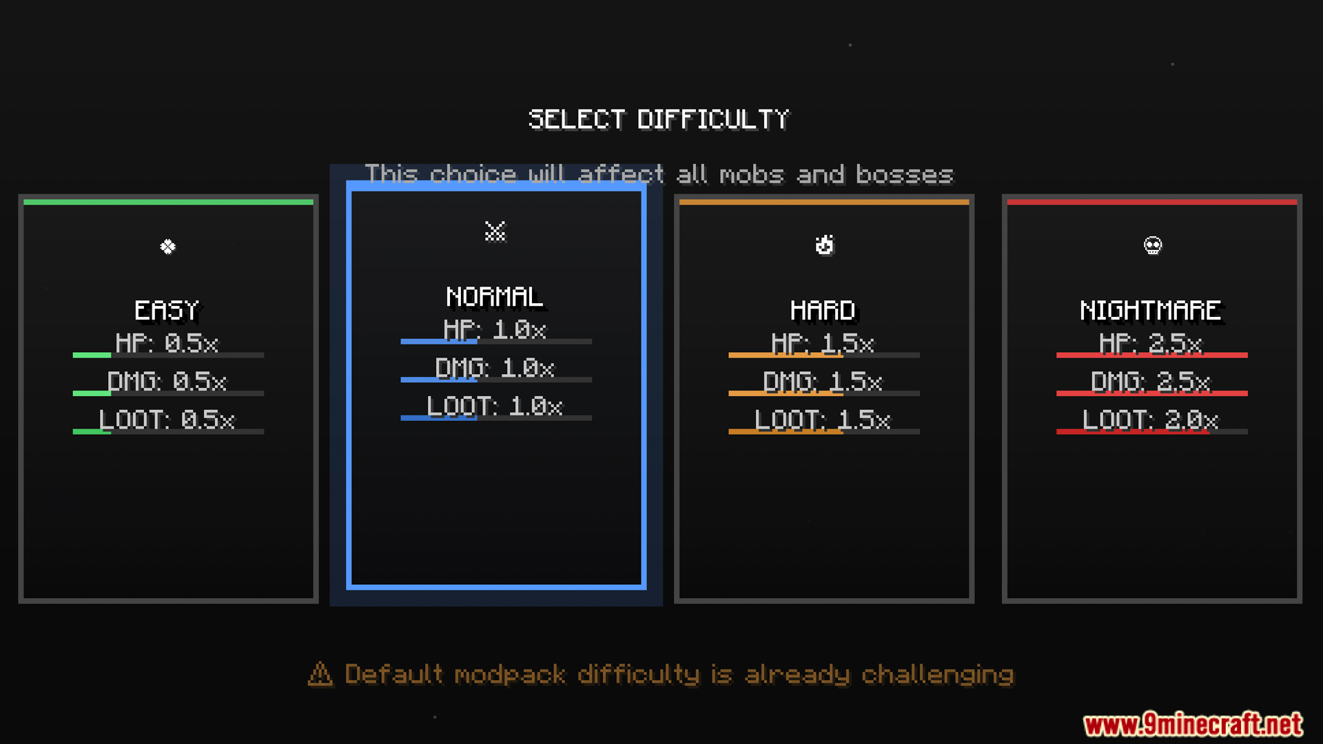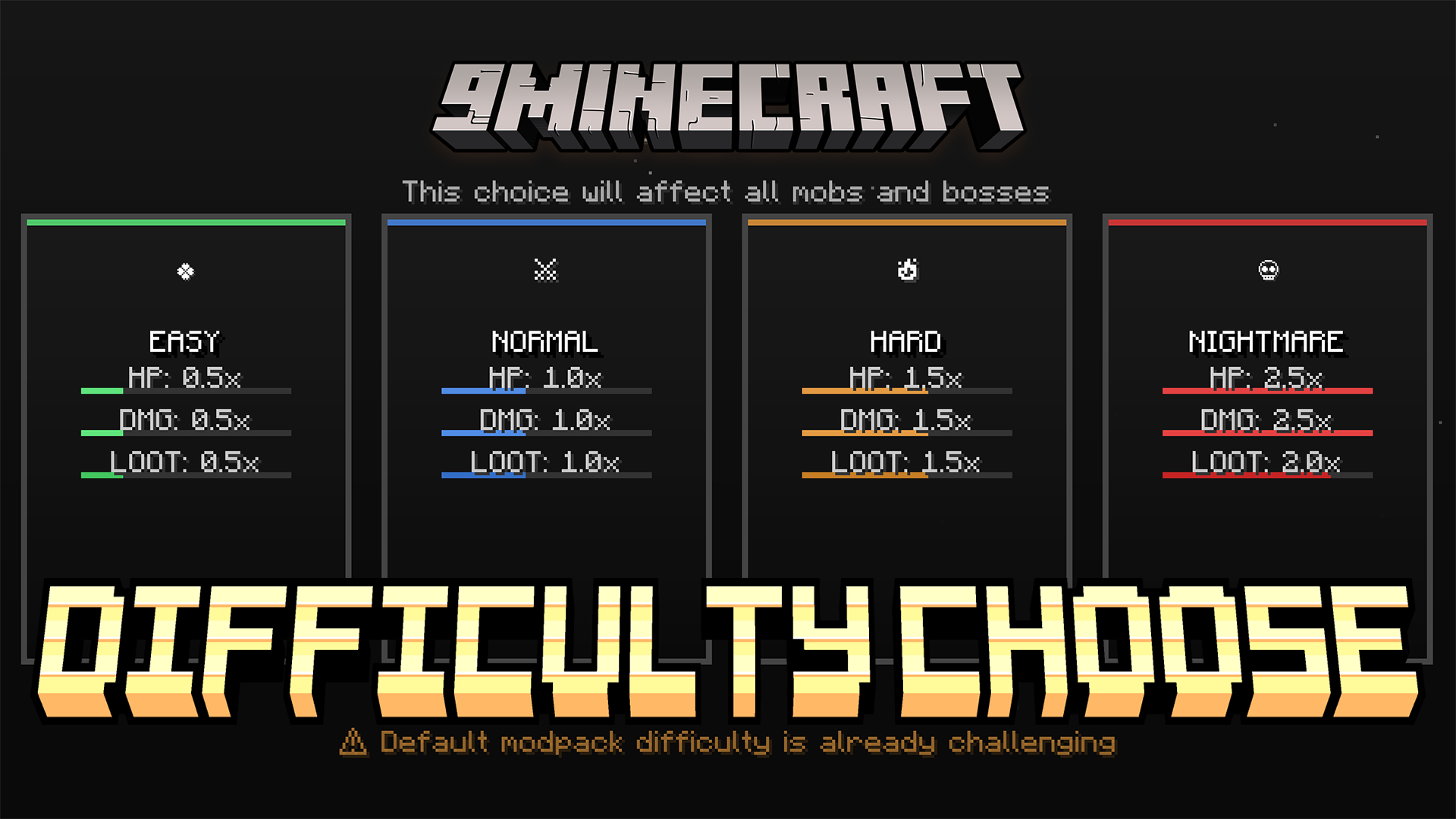 Difficulty Choose Mod (1.20.1, 1.20) is a small mod originally made for the Ascendra Modpack that lets you choose your difficulty when creating a new world. You can pick between four difficulty levels: Easy, Normal, Hard, and Nightmare. Each difficulty changes how the game plays by adjusting mob health, damage, and behavior.