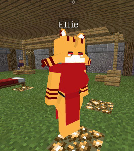 Dou Ellie Jenny Mod Model adapts Dou-Dou’s playful beastkin design with orange tiger fur, black/red stripes, perky ears and a fluffy tail, glowing red eyes, a loose red dress with arm bands, and scaled-up feline proportions with a seductive smirk.
