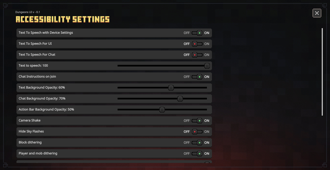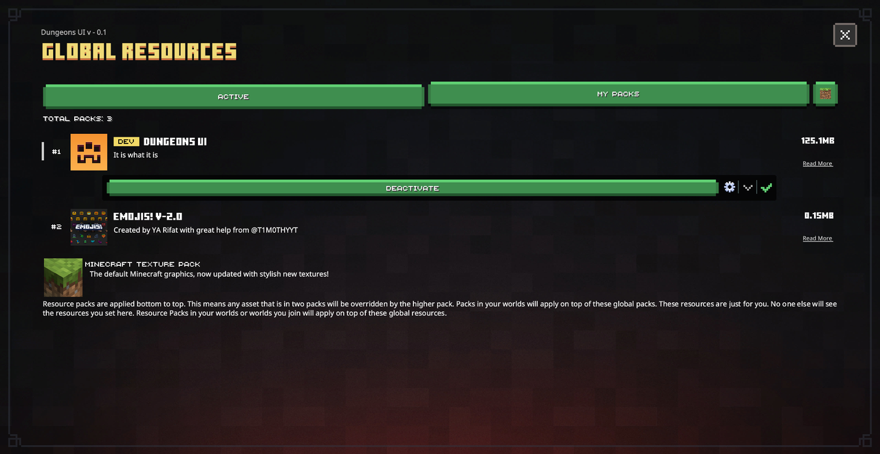 - This early-access pack overhauls multiple UI screens with Dungeons-inspired designs, dark themes, ornate borders, and immersive elements. Not all screens are complete yet-some will soon transition to “Ore UI.” Includes an optional animated background subpack for extra flair (enable via pack settings icon; may reduce performance).
