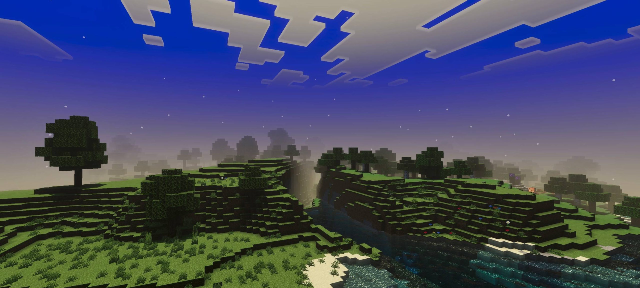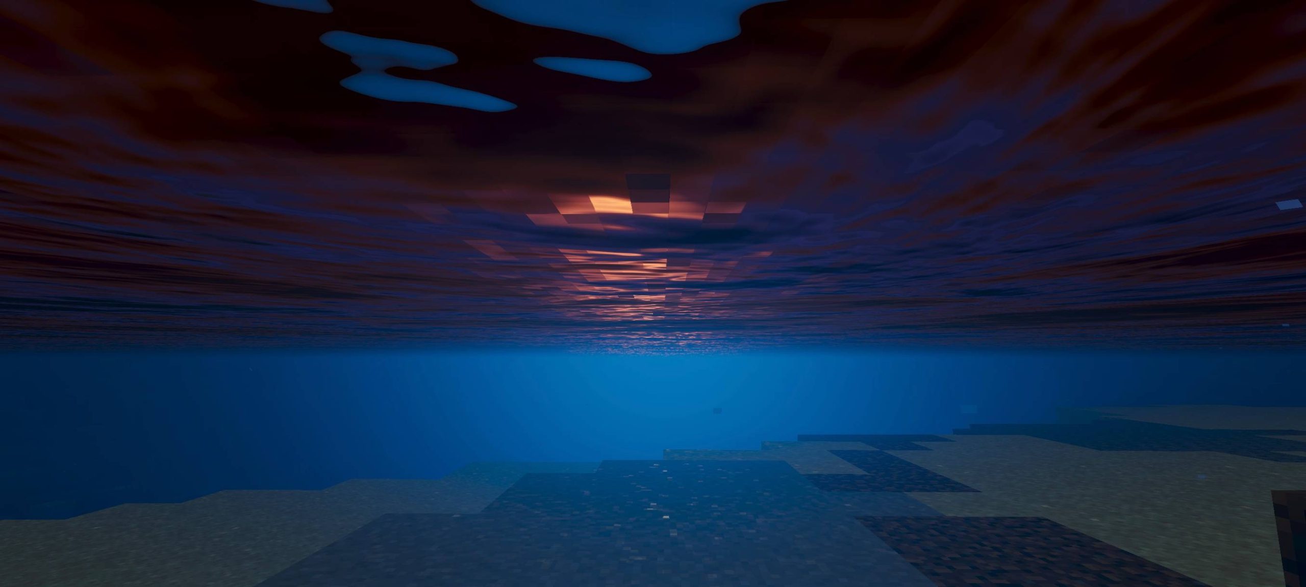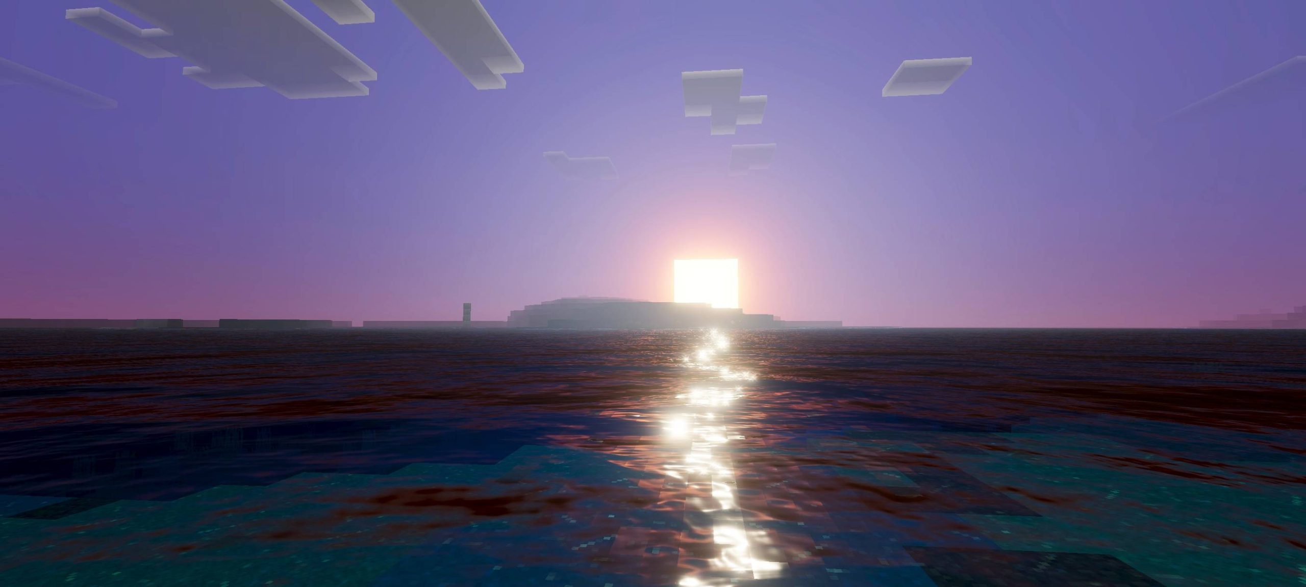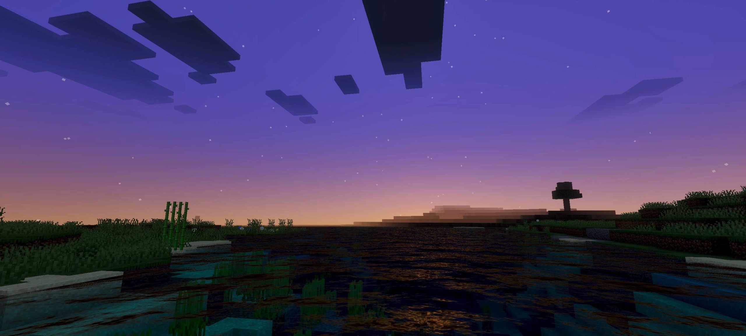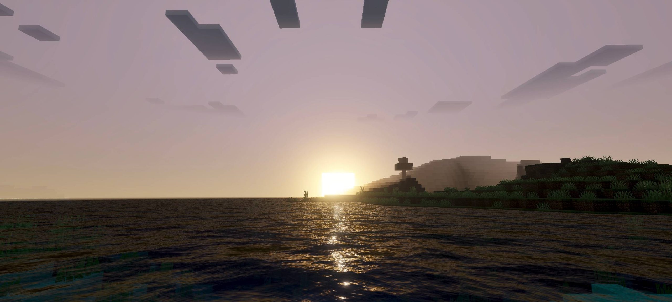 Dusk Dawn Shade Shader (v26, 1.21) focuses on the changing light at dawn and dusk. This shade creates transitional color bands in the sky and a soft, golden glow. Key features include enhanced sunlight, subtle shadows, and reflections on water.