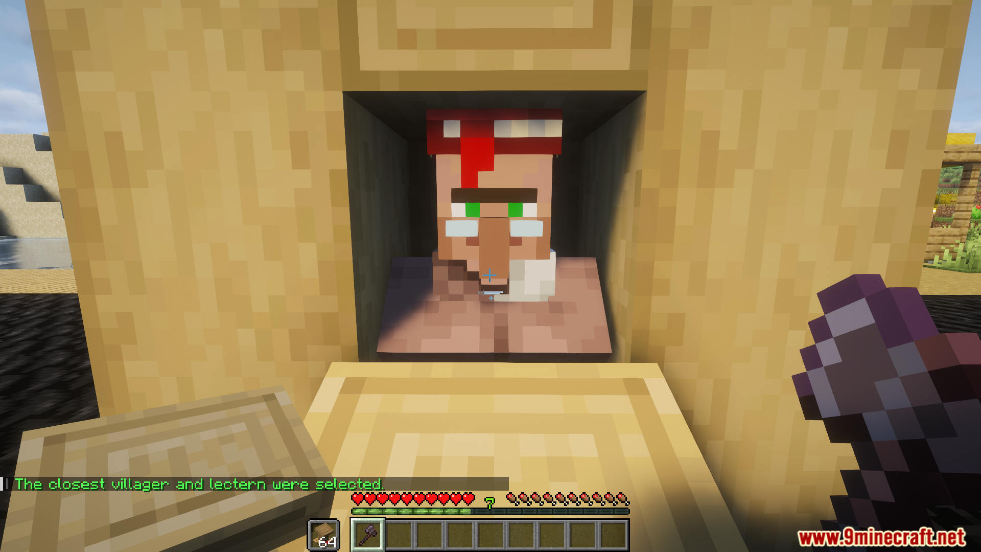 - Prepare by equipping any axe in your main hand and holding some lecterns in your offhand.