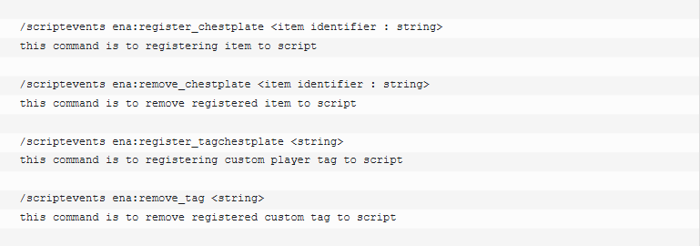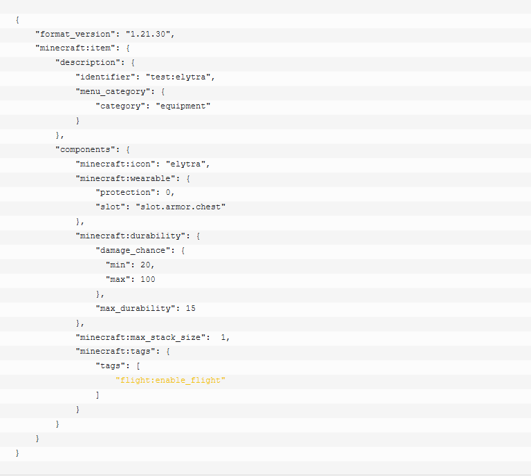 Using this addon as dependencies for your addons can make developers create custom elytra by defining custom tags in the item tags component called “flight:enable_flight” or using a custom scriptevent command to add a player custom tag to trigger flight, or registeringa custom chestplate item to the world but it only registered on the memory so you should registering at the first world loaded or using tick function commands but I doesn’t recommended it