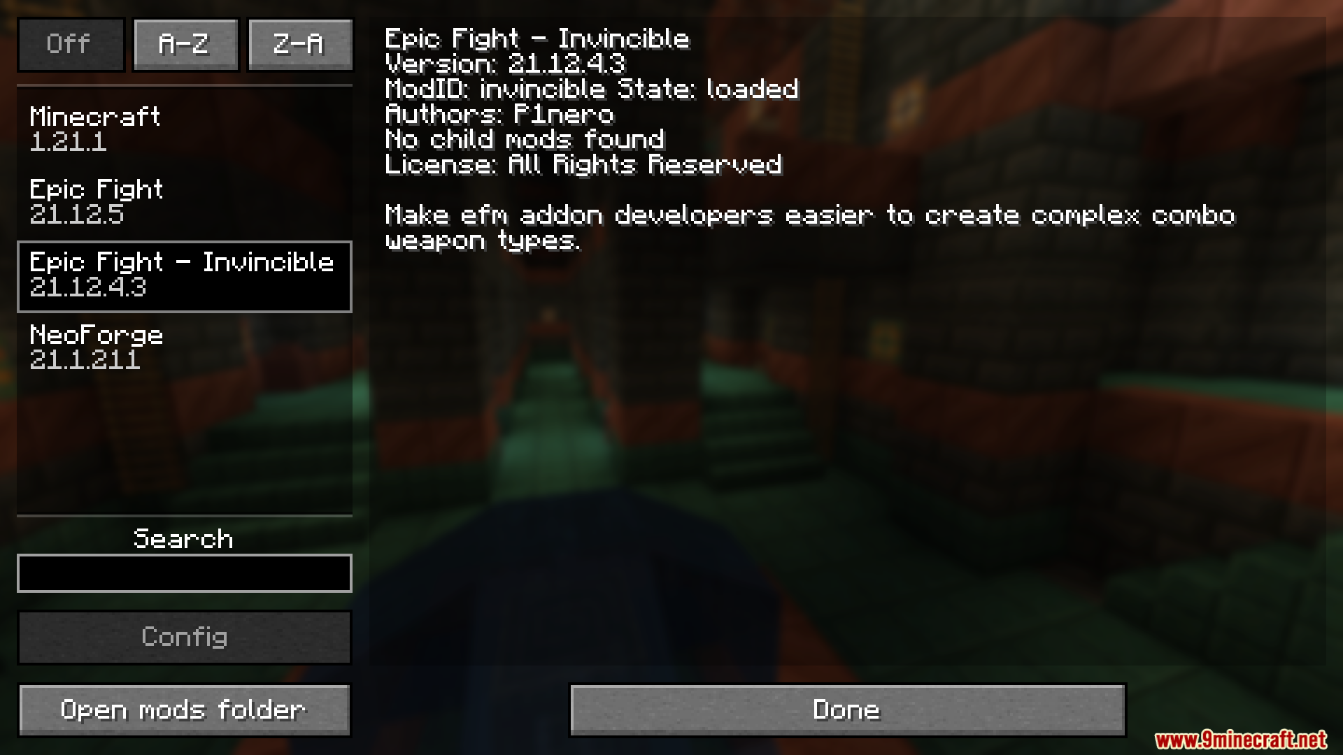 Epic Fight Invincible Lib Mod (1.21.1, 1.20.1) is a lightweight supporting library for the combat-focused Epic Fight framework, designed to make registering powerful combo systems and weapon moves easier for mod and data-pack creators.