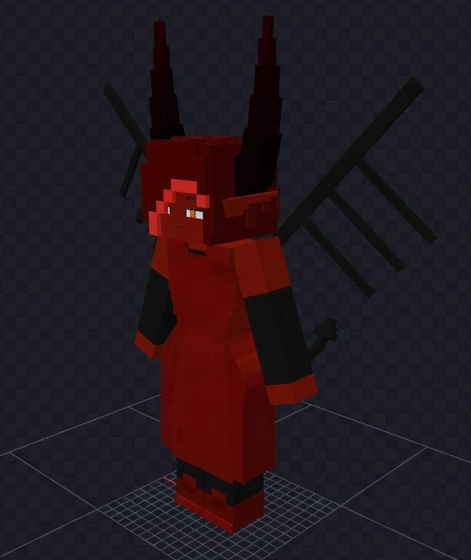 Evelyth Galath Mod Model features a red body, large black horns, and dark wings. The design emphasizes a powerful and intimidating appearance. Dark accessories and sharp shapes suggest a supernatural theme.