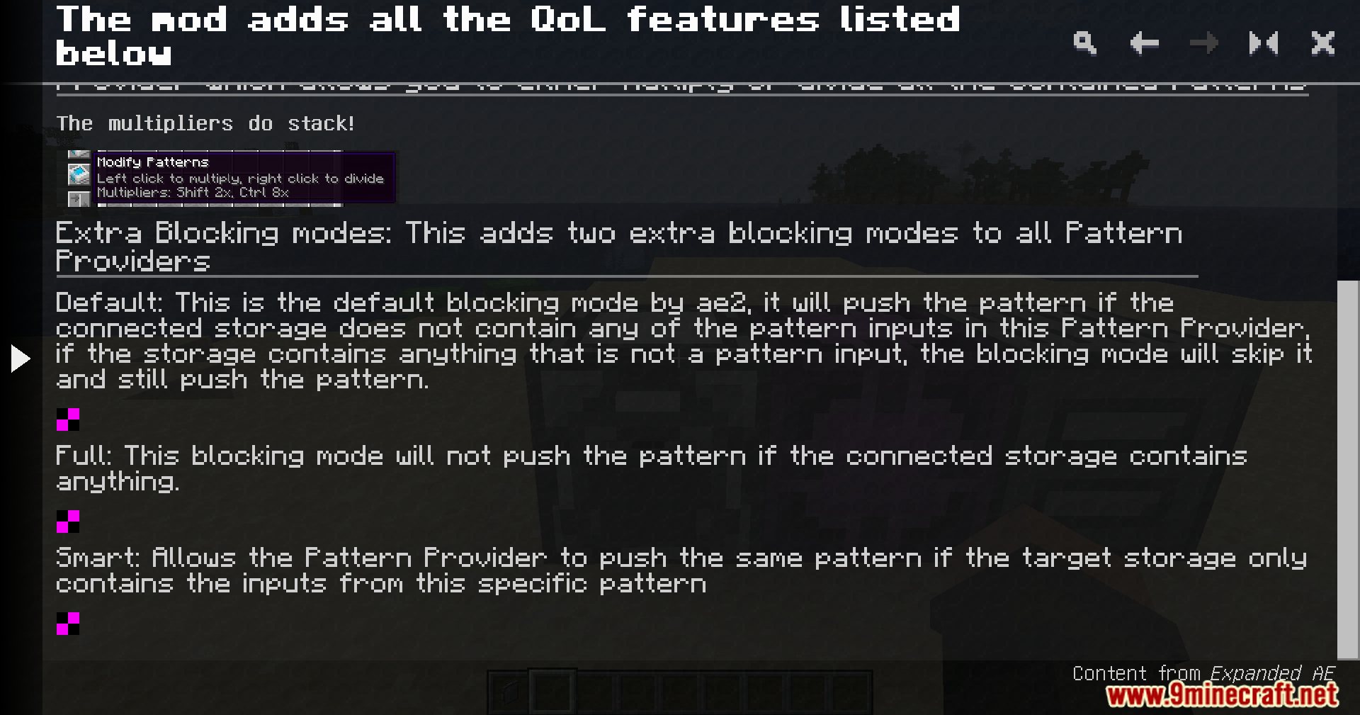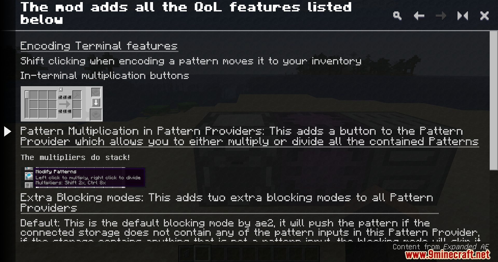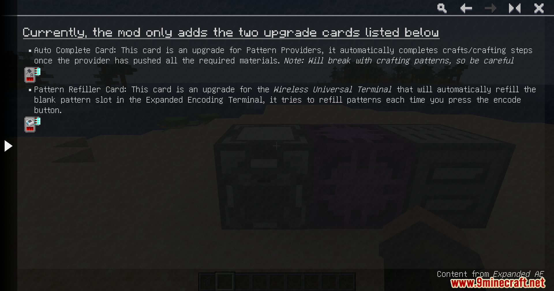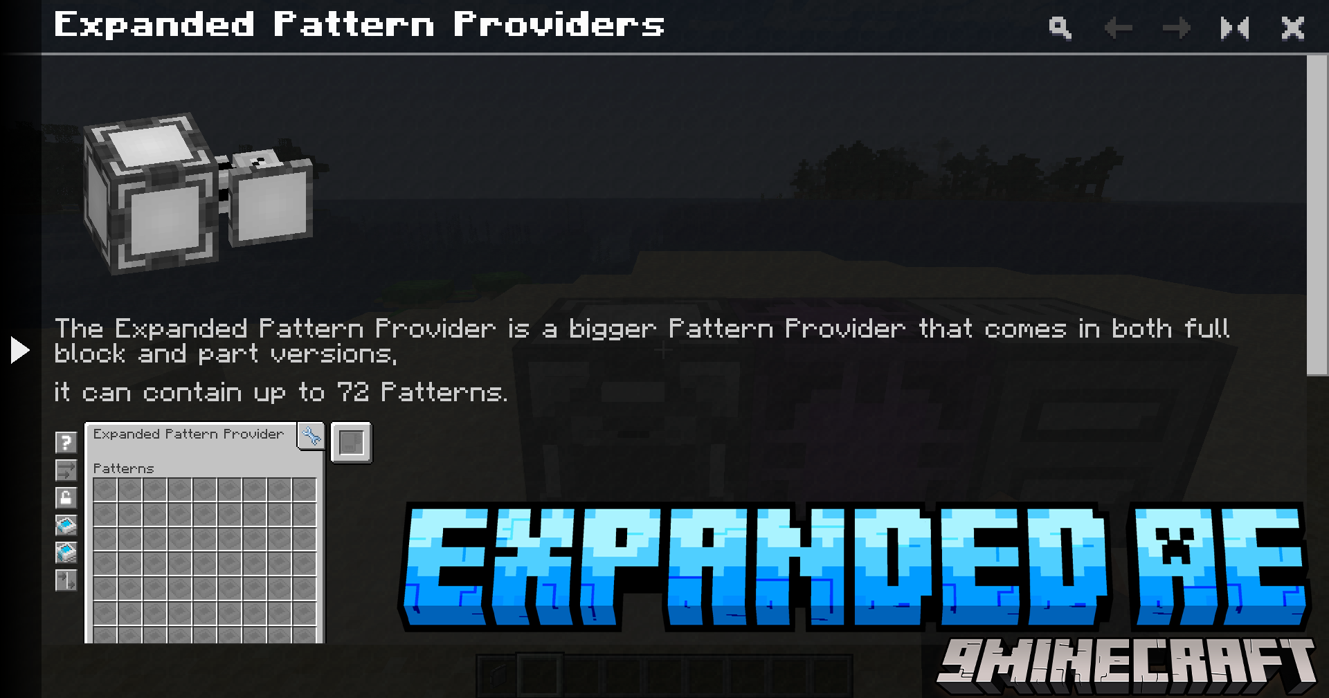 Expanded AE Mod (1.21.1, 1.20.1) improves automation and crafting with enhanced pattern tools and processing power. It introduces expanded pattern providers, upgraded encoding terminals, and high-capacity co-processing units, while also offering new utility cards for streamlined crafting.