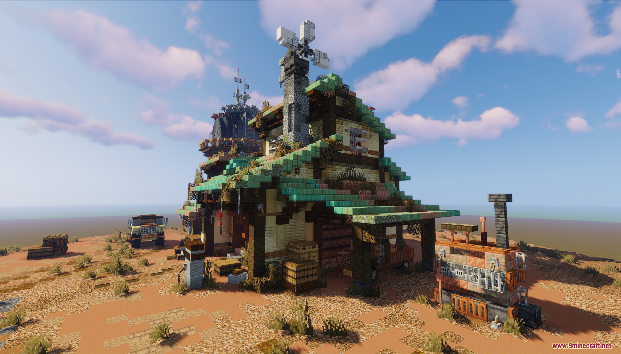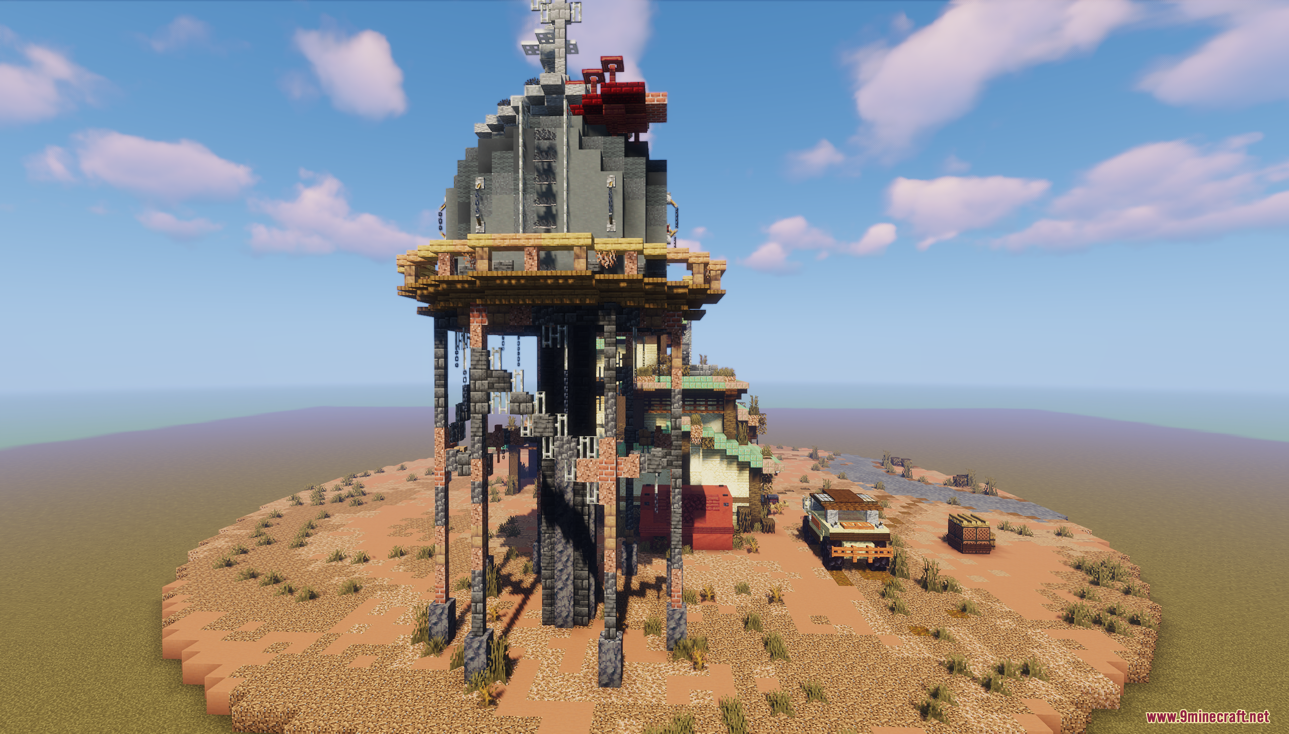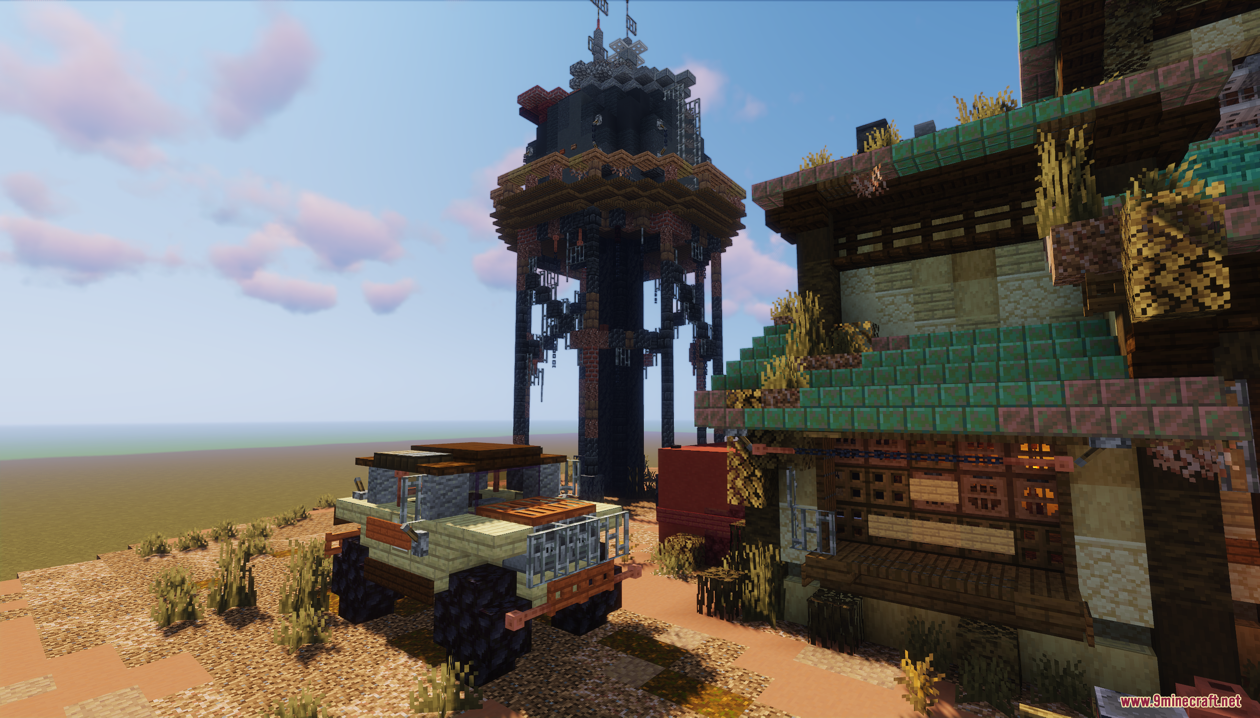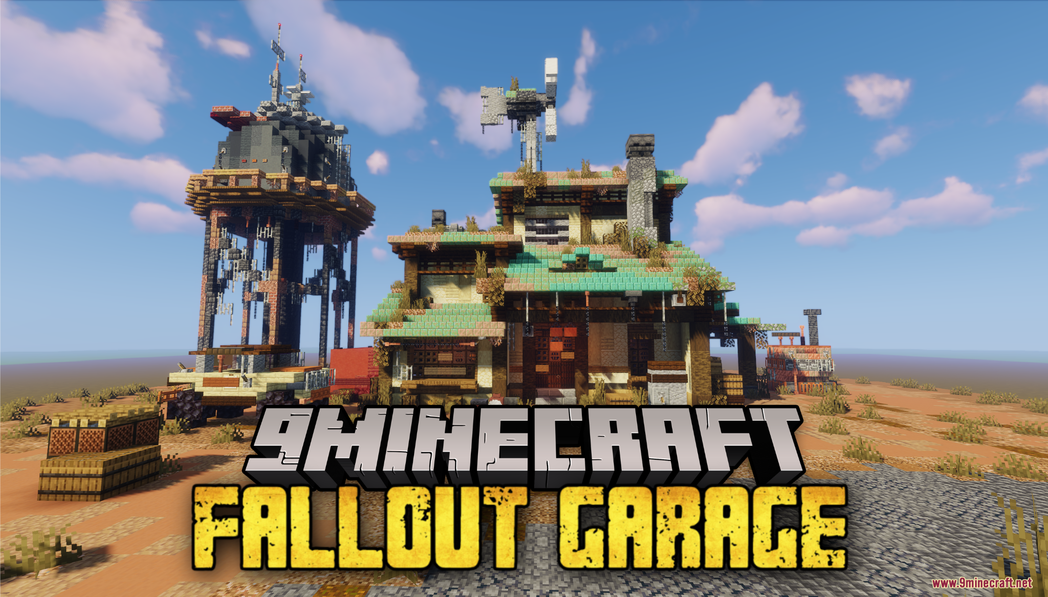 Fallout Garage Map (1.21.11, 1.20.1) drops you into a rugged, post-apocalyptic desert setting inspired by Fallout’s iconic aesthetic. The centerpiece is a weathered garage surrounded by rusted vehicles, scattered supplies, and a towering structure with antennas, all set against a backdrop of red mesas and barren terrain. This map is perfect for survival roleplay, cinematic builds, or creating your own wasteland adventures in a gritty, immersive environment.