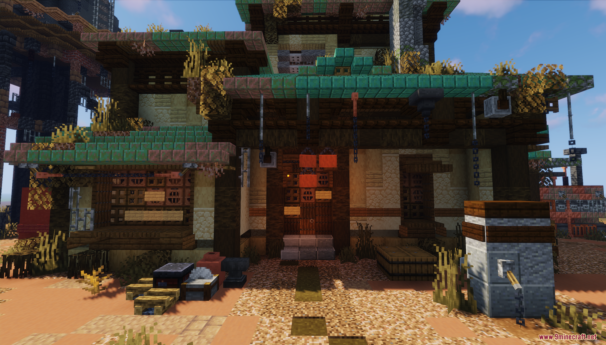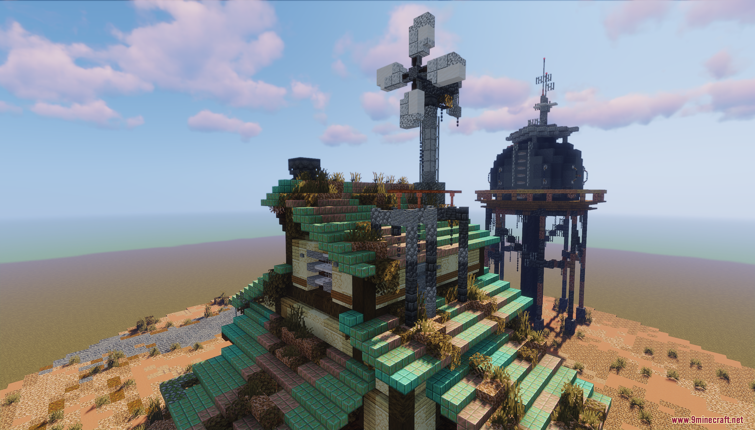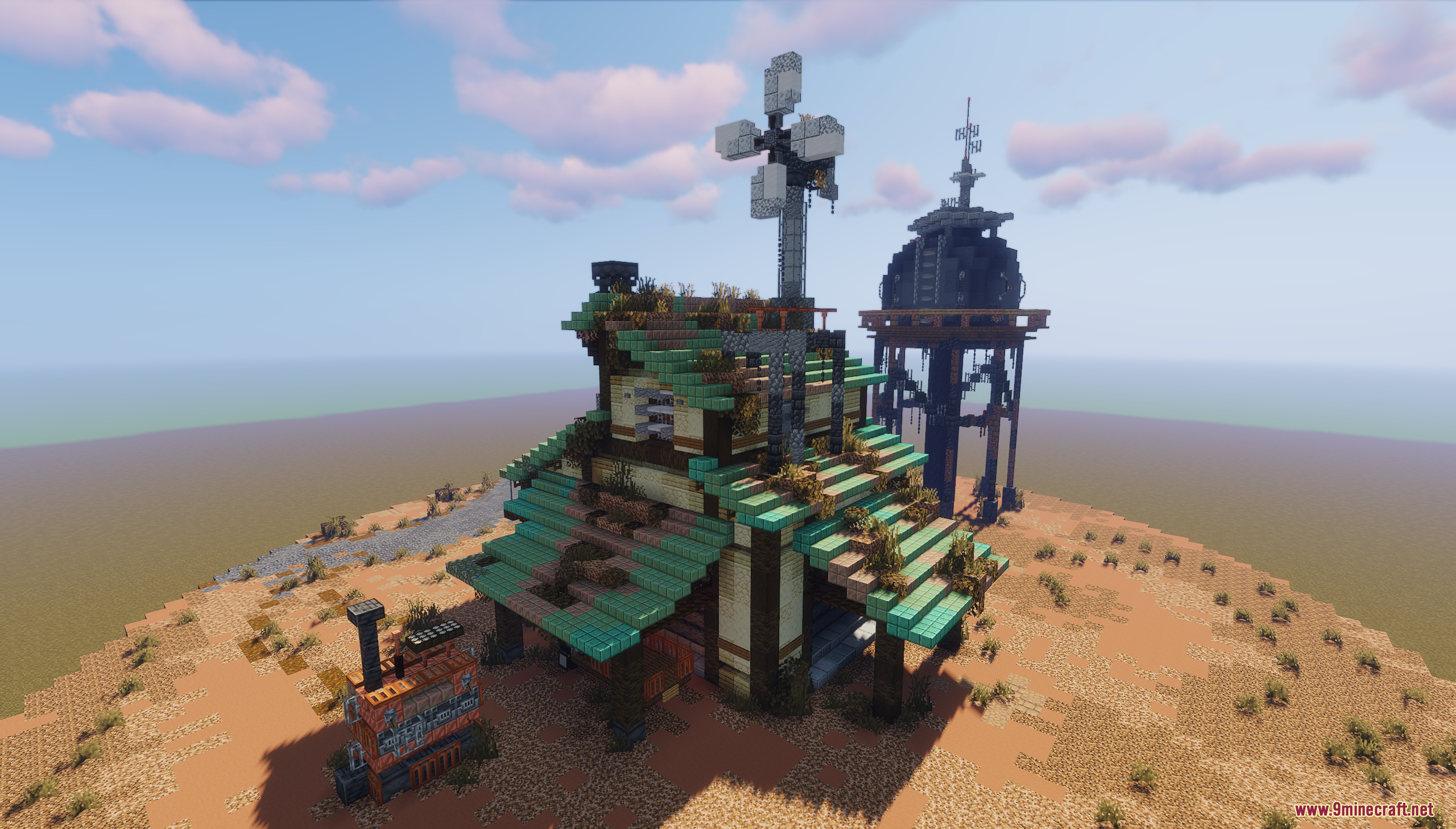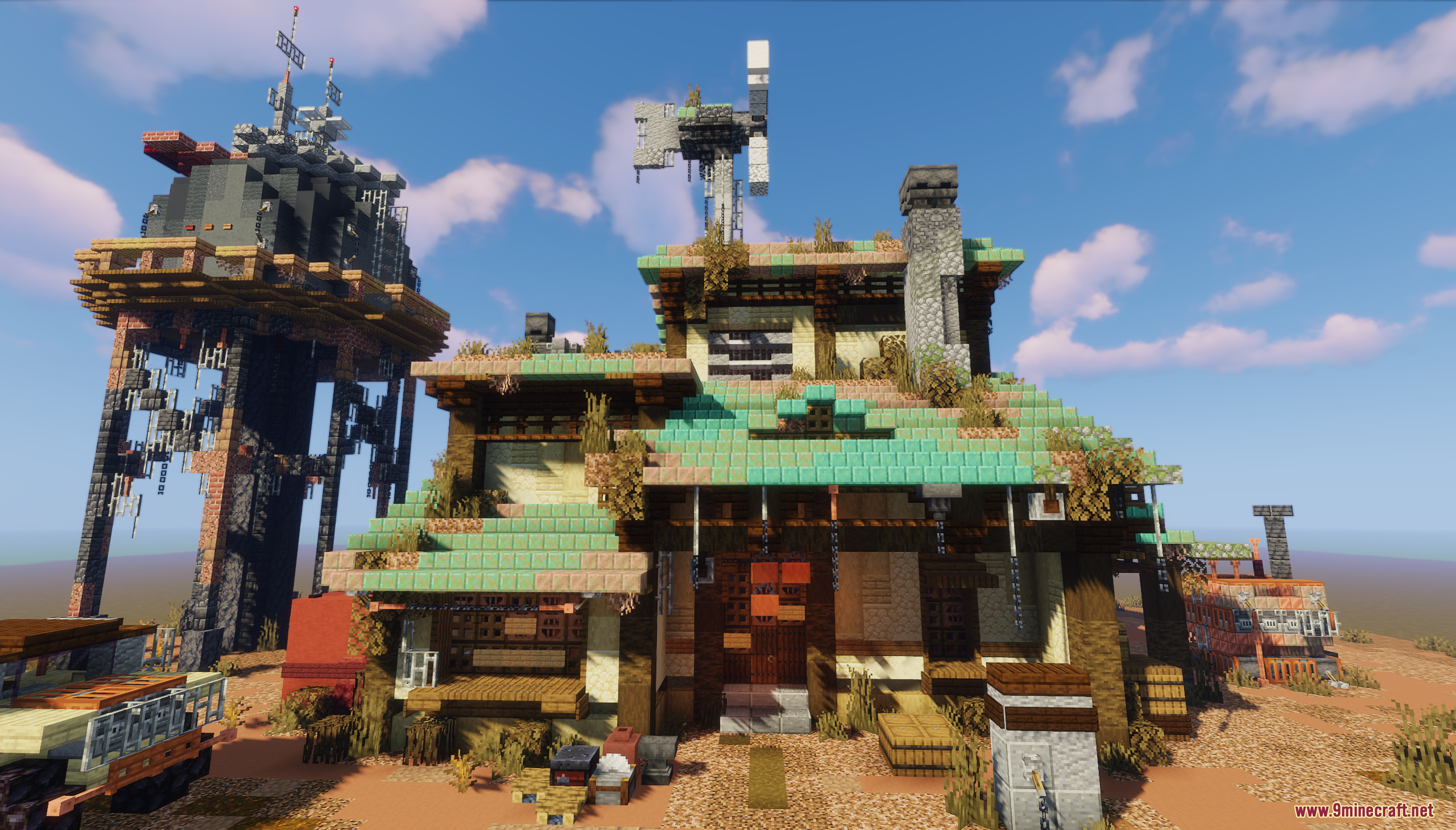 Fallout Garage Map (1.21.11, 1.20.1) drops you into a rugged, post-apocalyptic desert setting inspired by Fallout’s iconic aesthetic. The centerpiece is a weathered garage surrounded by rusted vehicles, scattered supplies, and a towering structure with antennas, all set against a backdrop of red mesas and barren terrain. This map is perfect for survival roleplay, cinematic builds, or creating your own wasteland adventures in a gritty, immersive environment.