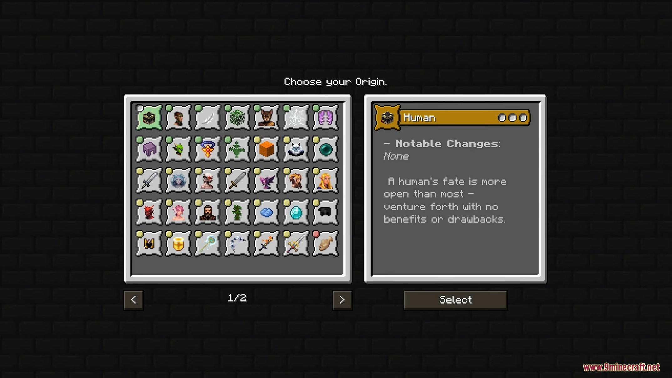 - Origins system that changes starting traits